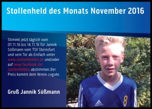 (zg) Jannik Süßmann will „Stollenheld des Monats“ werden. Der Zwölfjährige, der für die D-Junioren des TSV Phönix Steinsfurt seine Fußballschuhe schnürt, bewirbt sich mit einem Traumtor bei dem Video-Wettbewerb im Internet. Vom 07.November (10:00 Uhr) bis kommenden Montag, 14. November (16:00 Uhr), kann noch für ihn abgestimmt werden.