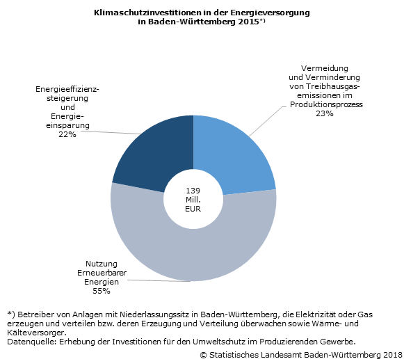 (zg) Die Betriebe der Energieversorgung1 in Baden-Württemberg haben im Jahr 2015 insgesamt rund 140 Millionen Euro (Mill. EUR) in Maßnahmen zum Klimaschutz investiert. Wie das Statistische Landesamt mitteilt, wurden diese Investitionen von 122 Betreibern mit Sitz in Baden-Württemberg getätigt, das entspricht jedem vierten der befragten Energieversorger im Land. Die Investitionssumme ist damit im Vergleich zum Vorjahr um 42 % deutlich angestiegen. Rund 9 % der Gesamtinvestitionen der Branche wurden im Jahr 2015 für Klimaschutzmaßnahmen aufgewendet.