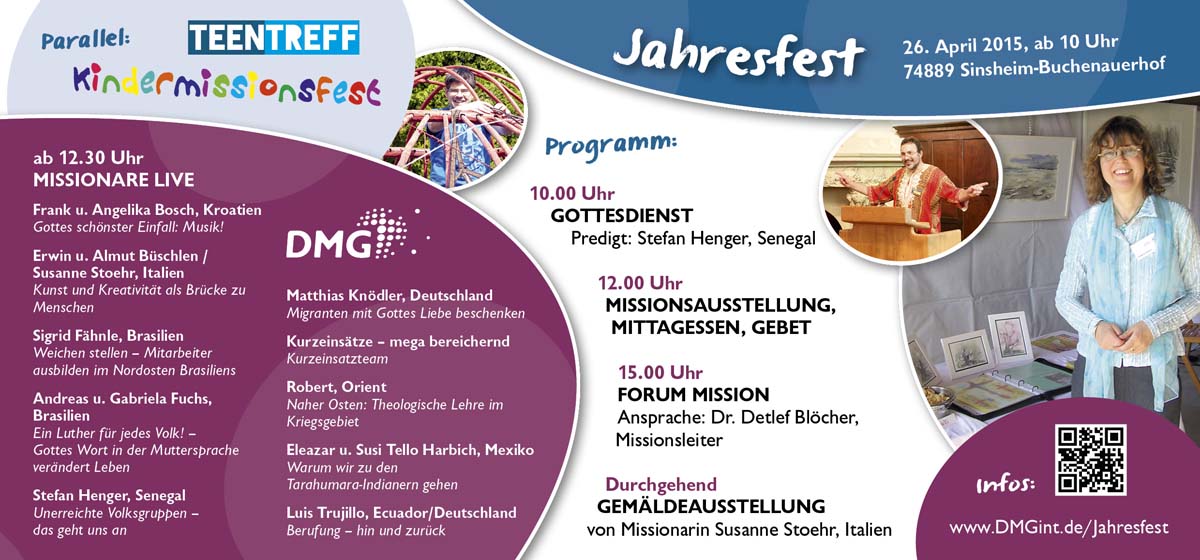 (zg) Jesus bekannt machen und den Menschen helfen. Darum geht es beim Jahresfest des christlichen Missions- und Hilfswerks „DMG interpersonal“ (www.dmgint.de) am 26. April 2015 in dessen Zentrale Buchenauerhof bei Sinsheim-Weiler. Die Welt rückt zusammen. Deshalb lädt die DMG Jung und Alt ein, über Völker, Kulturen, Begegnung, Integration und Glaube nachzudenken, unter dem Motto: „Jesus (un)bekannt.“ 350 Mitarbeiter der DMG sind von Sinsheim aus in 80 Ländern weltweit in kirchlichen und sozialen Aufgaben im Einsatz. Einige dieser Missionare gestalten das Jahresfest aktiv mit. Eine Veranstaltung für die ganze Familie; parallel gibt es ein Teenager- und Kinderfest.