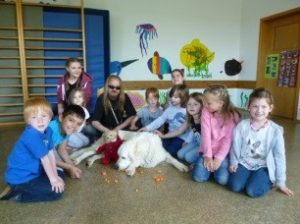 (zg) Die Freude war groß, als es endlich so weit war: Jimmy kam zu Besuch zu den „Blauwalen“ der evang. Kita „Schatztruhe“. Mit dabei: Baily, sein Blindenführhund. Vorbereitend hatten sich die Kinder an verschiedenen Stationen zum Thema „Alltag eines blinden Menschen“ ausprobiert (z.B. blind ein Butterbrot schmieren, Lebensmittel erschmecken, blind einen Hindernisparcours laufen…). Ihre Erfahrungen dabei teilten sie Jimmy mit. Es entstand ein angeregter Austausch und viele Kinderfragen wurden beantwortet. Baily genoss es von den Kindern gebürstet und gestreichelt zu werden und ließ sich die Karottenstücke schmecken. Dieser alljährliche Besuch ist für die „Blauwale“ immer wieder ein Highlight. Viele Kinder kennen Jimmy aus dem Schlosspark, gehen offen auf ihn zu und bieten ihre Hilfe an, wenn er sich mal nicht zurechtfindet. Auch Kinder die Angst vor Hunden haben, trauen sich beim Besuch in der Kita dabei zu sein und können so Angst abbauen. Herzlichen Dank an Jimmy für seine Besuche, die den Kindergarten-Alltag bereichern.