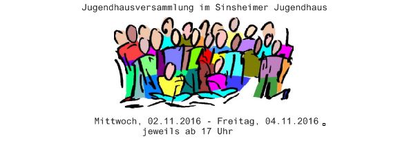 (zg) Von Mittwoch, den 02.11.16 bis Freitag, den 04.11.16, findet im Sinsheimer Jugendhaus eine Jugendhausversammlung statt. Alle interessierten Jugendlichen, die gerne über die Situation in ihrem Jugendhaus diskutieren möchten, sind eingeladen jeweils ab 17 Uhr in die Räume des Jugendhauses (Lilienthalstraße 7) zu kommen.