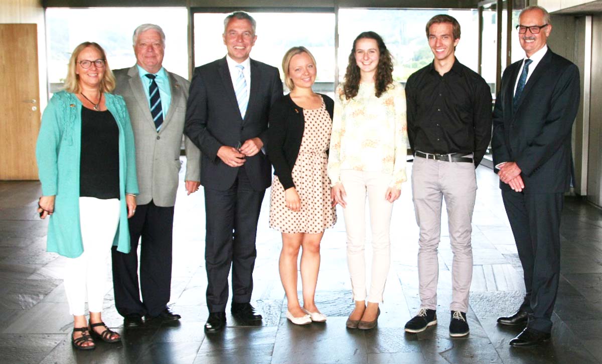 (zg) Über Besuch von zwei Kunststipendiaten freute sich kürzlich Landrat Stefan Dallinger. Im Rahmen des wechselseitigen Austauschs zwischen dem Rhein-Neckar-Kreis und seiner schwedischen Partnerregion Östergötland waren die Bratschistin Lovisa Säfström (4.v.l.) aus Motala – gemeinsam mit ihrer Mutter Birgitta Säfstrom (l.) – und die Sopranistin Luisa Burger (3.v.r.) aus Angelbachtal – gemeinsam mit ihrem Freund Arthur Hoffmann (2.v.r.) zu Gast im Landratsamt Rhein-Neckar-Kreis in Heidelberg. Beide Jugendliche haben ein Kunststipendium im Bereich Musik erhalten.