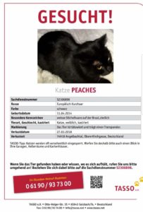 Bitte helfen Sie bei der Suche nach der Katze Peaches. Sie wird seit 27.3.18 in Angelbachtal vermisst vermisst. Ebenso wird der Kater eines Nachbarn seit 3 Tagen vermisst. Hoffentlich sind keine Katzenfänger unterwegs.
