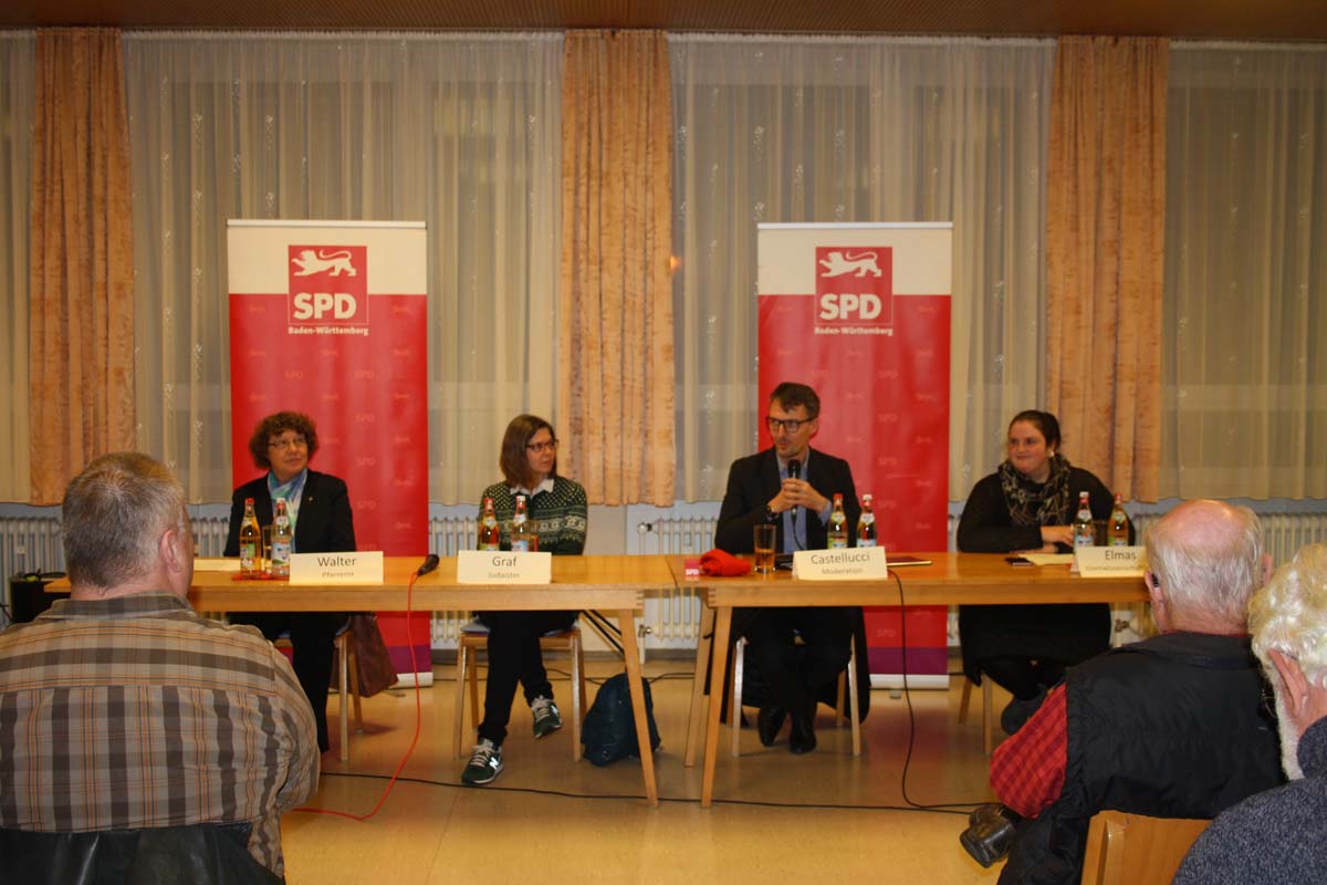 Bild der letztjährigen Podiumsdiskussion (Bildunterschrift: Das Podium von 2016 hat sein Kommen wieder zugesagt. v.l. Pfarrerin Ulrike Walter, Esther Graf, Lars Castellucci, Elif Elmas