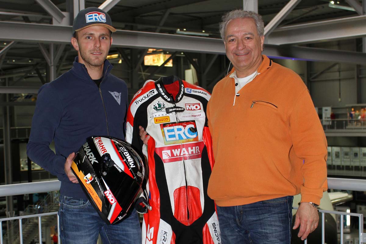 Foto : Kevin Wahr (Nagold) bei der Übergabe seiner Rennausrüstung mit Franz Rau (rechts) vom Technik Museum in Speyer (von Fotograf Andreas Stier)