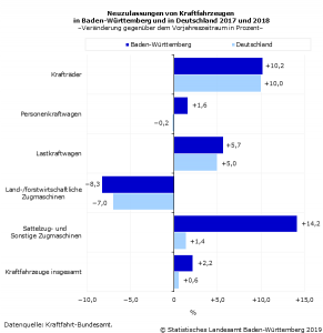 Der Nutzfahrzeugmarkt in Baden-Württemberg entwickelte sich 2018 uneinheitlich. Während Sattelzug- und sonstige Zugmaschinen (+14,2 %) sowie Lastkraftwagen (+5,7 %) deutlich mehr Neuzulassungen als im Vorjahr verzeichneten, wurden bei land- und forstwirtschaftlichen Zugmaschinen hingegen spürbar weniger Neuzulassungen als im Vorjahr verzeichnet (- 8,3 %).