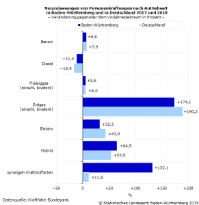 Nachrichtlich: Auf Bundesebene lag die Zuwachsrate für Neuzulassungen reiner Elektro-Pkw 2018 mit 43,9 % noch merklich höher als in Baden-Württemberg. Deutlich aufwärtsgerichtet entwickelten sich zudem die Hybrid-Pkw (+53,8 %). Insgesamt wurden auf Bundesebene 130 258 Hybrid-Pkw erstmalig neu zugelassen, bei den reinen Elektro-Pkw waren es 36 062 Fahrzeuge.