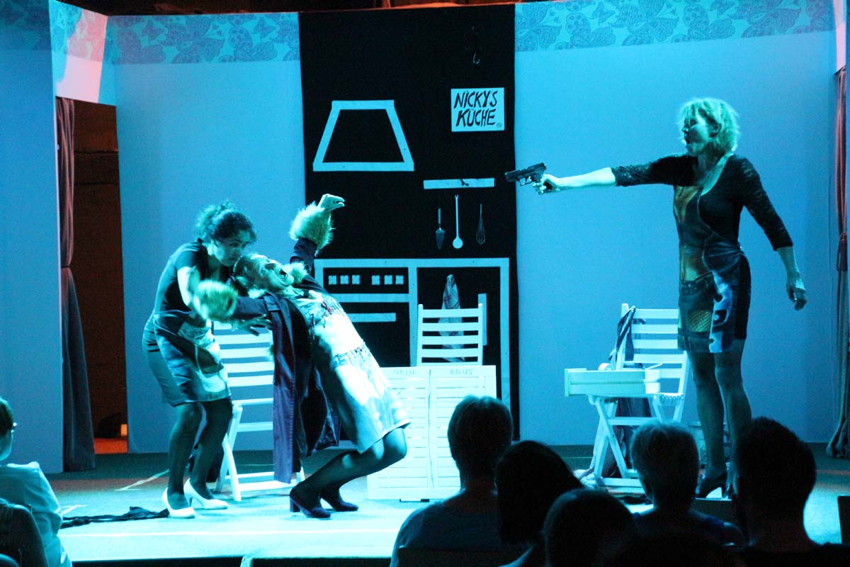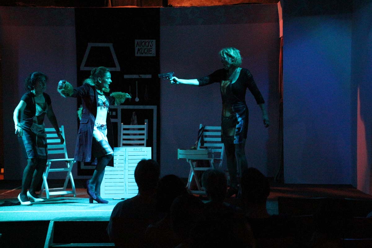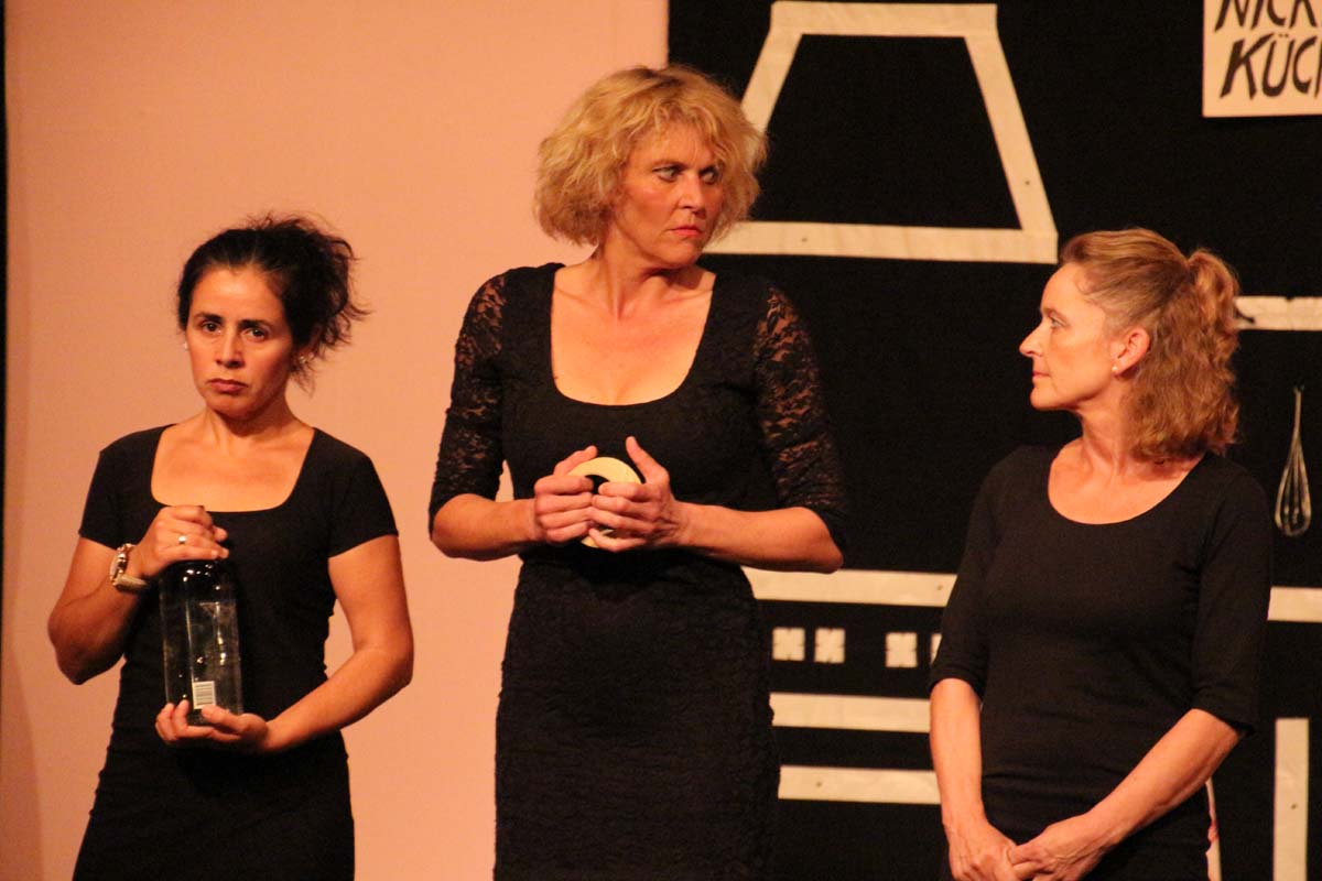 (cr) Wieder einmal präsentierte das Würfeltheater ein Sahnestückchen auf seiner kleinen aber feinen Tehaterbühne. Bei gefühlten Saunatemperaturen begeisterten die drei Akteurinnen Simone Laurentino dos Santos, Nici Neiss und Ute von Stockert mit ihrer coolen Krimikomödie. Soll man die kaltgestellten Ehemänner aus ihrer misslichen Lage befreien oder nicht? Diese kleine Geschichte steigerte sich von Szene zu Szene bis zum überraschenden Finale. Am Ende überlegten sich die Männer im Publikum ob sie jemals sich ein Kühlhaus in die eigenen vier Wände eingauen lassen, denn man weiss ja nie. Dieses Würfeltheater muss man einfach lieben, doch vielleicht finden sich ein paar grosszügige Spender für eine Klima- oder Entlüftungsanlage.