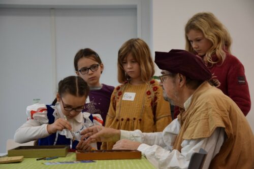 Literaturpädagogin Evelyn Gangl aus Heidelberg setzte die Idee der historischen Entdeckungsreise um. Am ersten Tag der Projektwoche in den Herbstferien wurden dreizehn Grundschulkinder selbst zu Mittelalterforschern. Sie erhielten in Kleingruppen verschiedene Aufgaben im Stadtmuseum und in der Stadt wie beispielsweise die Untersuchung der Reste der alten Stadtburg. Nach der Beantwortung erhielt jedes Kind ein ledergebundenes Buch mit leeren Seiten. Während der vier Tage füllten sie es als Forschertagebuch mit ihren Erlebnissen. Am ersten Tag erfuhren die Kinder einiges über die Geschichte der Stadt und die Aufgabe eines Museums. Der zweite Tag stand ganz im Zeichen der bunten Welt der Wappen – unter anderem wurde gemeinsam ein Wappen für die Stadtbibliothek erstellt, aber auch das eigene Familienwappen wurde gestaltet und im Forschertagebuch verewigt. Wie das Leben auf der Burg wirklich war, spielten die Kinder mit Kostümierung am dritten Tag nach. Außerdem dachten sie sich gemeinsam Geschichten aus dem Mittelalter aus. Der Abschlusstag der Projektwoche stand ganz im Zeichen von alter Schrift und Schreiben mit der Feder. Außerdem wurde der Weg von den mittelalterlichen Skriptorien hin zum Druck mit beweglichen Lettern durch Johannes Gutenberg gezeichnet. Zu Gast waren Hans Helter und Karl Kretschmer von der Druckwerkstatt „Pigmentum et Carta“ aus Mosbach mit einer mobilen Druckerpresse, die natürlich auch zum Einsatz kam. Ganz schön knifflig war das Setzen des eigenen Namens in spiegelverkehrter Reihenfolge aber am Ende hielt jedes Kind eine eigene Teilnehmerurkunde in den Händen.