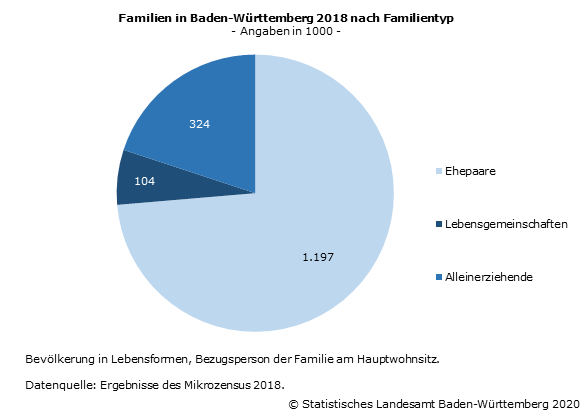 In Baden-Württemberg lebten 2018 nach Ergebnissen des Mikrozensus rund 1,63 Millionen (Mill.) Familien mit insgesamt 5,67 Mill. Familienmitgliedern. Familien machten damit knapp 52 % der Bevölkerung aus. In den Familien lebten insgesamt 2,75 Mill. Kinder. In fast drei Viertel der Familien lebten die Kinder bei verheirateten Eltern (73,6 %), bei einem Fünftel wuchsen die Kinder nur mit einem Elternteil auf, bei gut 6 % der Familien waren die Eltern nicht verheiratet. Bei unverheirateten Eltern lebten im Durchschnitt 1,5 Kinder, bei Ehepaaren 1,8 und bei Alleinerziehenden 1,4 Kinder.