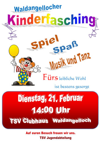 Bei heiteren Spielen und viel Spaß werden wir einen schönen Nachmittag im TSV Clubhaus (Götzenbergstraße 6, 74889 Sinsheim – Waldangelloch) verbringen. Die besten Masken und Kostüme werden prämiert! Fürs leibliche Wohl ist bestens gesorgt. Auf euren Besuch freuen wir uns, TSV Jugendabteilung.