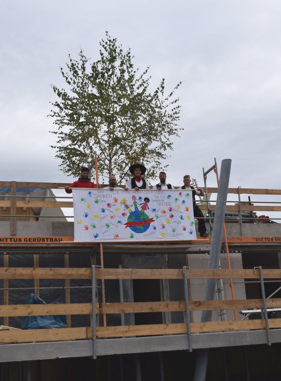 Bild (Stadt Sinsheim): Zum Richtspruch wurde vom Dach des Neubaus das Dankesbanner der Kindergartenkinder entrollt
