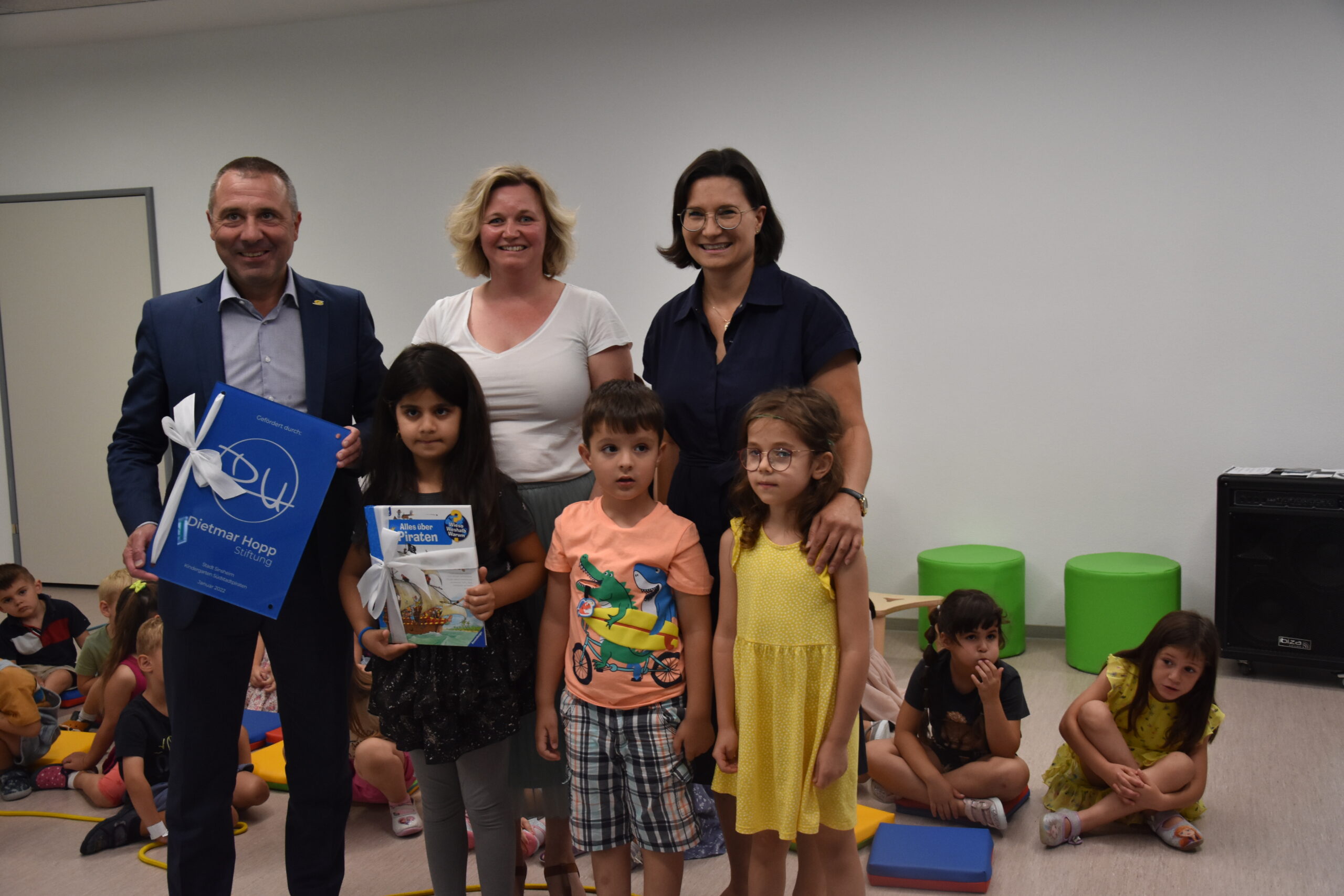 Die Corona-Schutzmaßnahmen hatten eine offizielle Einweihung nach der Namensenthüllung bisher verhindert. Nun trafen sich Vertreter der Stadt, der Dietmar Hopp Stiftung und Gäste ein halbes Jahr nach dem Umzug des Kindergartens zur offiziellen Einweihung in den neuen Räumlichkeiten. Die Kinder hatten zwei Lieder einstudiert, mit denen sie die Gäste im Kindergarten überraschten.