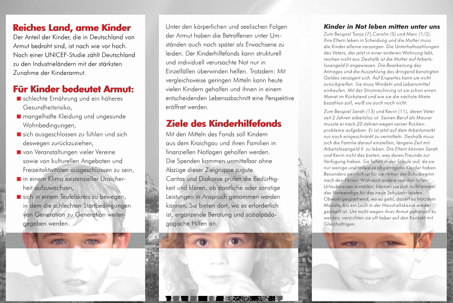 Der Kinderhilfefonds Kraichgau sowie die Kinderförderfonds Neckar – Bergstraße und Südliche Kurpfalz sind eingebettet in die Familien- und Lebensberatung, die Sozialberatung, die Schuldnerberatung, die Migrationsberatung, die Schwangeren- und Schwangerschafts-konfliktberatung sowie in verschiedene Projekte für Kinder und Jugendliche, die von Caritas und Diakonie angeboten werden. In diesem Rahmen können sie sinnvolle Hilfe leisten und auch dazu beitragen, das Thema Kinderarmut immer wieder öffentlich zu machen.