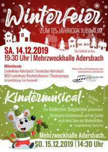 (zg) Samstag, den 14. Dezember, beginnt um 19:30 Uhr mit der Winterfeier des Gesangvereins Liederkranz Adersbach der Ausklang des Jubiläumsjahres. Sonntags, am 15. Dezember, präsentiert der Kinderchor Berglerchen um 14:30 Uhr sein Musical. Der Eintritt ist an beiden Tagen frei.
