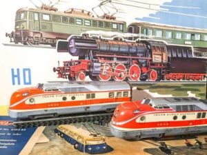 Kaufhäuser boten in der Nachkriegszeit Produkte für die Masse, die Spannweite reichte von teuer bis zu erschwinglich auch für den kleinen Geldbeutel. Diesen preisgünstigen Bereich deckten die Kaufhausbahnen im Modellbahn-Sektor ab. Mit ihrer einfachen Herstellung überwiegend aus Blech und einer recht überschaubaren Technik, wurden sie meist als Sortimentspackungen angeboten. Die Schauanlagen der Kaufhäuser in den 50er und 60er Jahren mit wunderschönen Tinplate-Modellen der Firmen Beckh, Bub, Distler oder Dressler inspirierten schon damals die großen und kleinen Modellbahn-Fans. In Gedanken wurden Anlagen entworfen, Züge zusammengestellt, Landschaften gestaltet und mit Leben erfüllt. Eines der herausragenden Fahrzeuge war der TEE-Triebwagen von Distler aus Blech, der auch gut 50 Jahre nach seiner Entstehung, mit Fahrverhalten und Sound aus einer längst vergangenen Zeit, auf der Modellbahn-Anlage von Mr. Eisenbahnromantik ein hervorragendes Bild abgibt. Das ist Eisenbahn-Geschichte live, die ein Highlight für jeden echten Modellbahner ist.