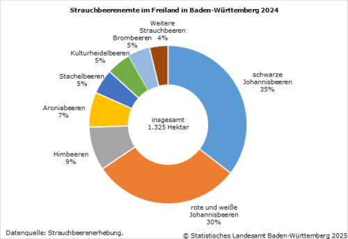 Nach Feststellung des Statistischen Landesamtes Baden-Württemberg wurden im Jahr 2024 auf gut 10 Hektar (ha) rund 87 Tonnen (t) Kiwis und Mini-Kiwis (Kiwibeeren) im Freiland geerntet. Das entspricht einem Ertrag von circa 8 t/ha.