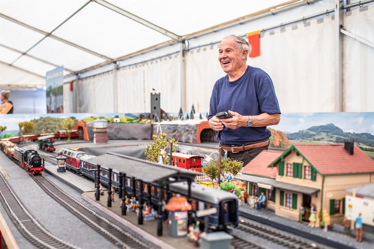 Mitten drin, an einer etwas kleineren aber nicht weniger imposanten Anlage, steht Heinrich Hartmann und steuert seine liebevoll gestaltete fast zehn Meter lange Gleise-Installation. Im Jahre 2006 kam er zu dem Hobby. Eine geschenkte Lok gab dazu den Anstoß, dass der Odenwälder bereits drei solcher Anlagen besitzt. Und diese wachsen ständig. „Das funktioniert nur, wenn die eigene Frau mitspielt“, fügt der lebensfrohe Rentner lachend hinzu, „sie ist für die Dekoration der Anlagen zuständig, besitzt mittlerweile aber auch bereits fünf eigene Loks.“ Während er die Wagons und Schienen kauft, entwirft und stellt er die Anlage selbst her: Bahnhof, Tunnel, Miniatur-Menschen, Landschaften und dergleichen. Dafür verwendet er Bauklötze sowie Material aus dem Haushalt und Baumarkt – alles nachhaltig und ökologisch. Auf die Frage, warum die Modellwelt die Menschen so begeistere, hatte Heinrich Hartmann eine einfache Erklärung: „Erst einmal der Basteltrieb … Dann die Nostalgie – gerade weil man Dampf- oder Dieselloks nicht mehr so oft im Original findet. Und die Möglichkeit sich zu entfalten, immer wieder was Neues zu kreieren … Es ist wirklich ein Freizeithobby, das nie endet.“