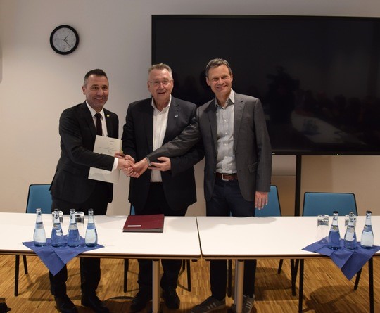 Sinsheims Oberbürgermeister Jörg Albrecht, Alfred Ehrhard und Dr. Bernd Welz (von links), die Vorstände der Klimastiftung für Bürger, nach der Unterzeichnung der Kooperation.