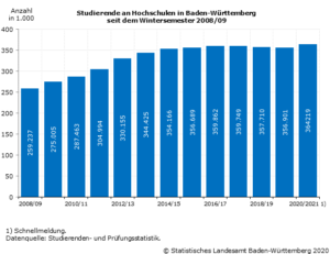 Nach vorläufigen Angaben des Statistischen Landesamtes sind im Wintersemester 2020/21 knapp 364 000 Studierende an den baden-württembergischen Hochschulen eingeschrieben. Dies stellt einen Zuwachs um knapp 7 300 Studierende oder 2,1 % im Vergleich zum Wintersemester 2019/20 dar. In den Jahren zuvor war die Anzahl der Studierenden seit 2016 leicht gesunken. Im Wintersemester 2020/21 begannen in Baden-Württemberg gut 57 300 Personen erstmals ein Studium an einer deutschen Hochschule. Das waren gut 3 600 Personen oder 6 % weniger als im Vorjahr.