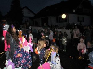 (zg) Unter diesem Motto trafen sich am vergangenen Donnerstag abends Kinder und Erwachsene vor unserem Kindergarten. Nach einer kurzen Begrüßung ging es auch schon los. Gemeinsam machten wir uns auf den Weg durch Helmhof und blieben an verschiedenen Stationen stehen um alle kräftig Laternenlieder zu singen. Dabei unterstützte uns Bianca Schaffert auf ihrer Gitarre.