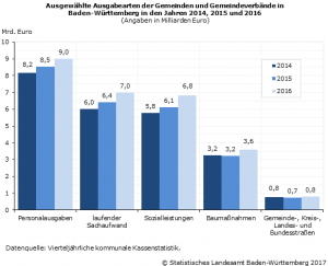 Die Ausgaben der laufenden Rechnung, also die Ausgaben, die keine Vermögensänderungen bewirken, übertrafen mit 30,3 Mrd. Euro das Niveau des Vorjahres um 7,5 Prozent. Darunter entfielen 9,0 Mrd. Euro auf die Personalausgaben (+6,0 Prozent) und 7,0 Mrd. Euro auf den laufenden Sachaufwand (+8,9 Prozent). Die Ausgaben für soziale Leistungen stiegen um 11,0 Prozent auf 6,8 Mrd. Euro. Davon entfielen 0,6 Mrd. Euro auf die Leistungen nach dem Asylbewerberleistungsgesetz, dies waren 84,9 Prozent mehr als im Jahr 2015. In der Kapitalrechnung werden alle Ausgaben erfasst, die vermögenswirksamen Charakter haben oder der Finanzierung von Investitionen dienen. Diese Ausgaben erhöhten sich um 8,8 Prozent auf 5,8 Mrd. Euro. Mit einem Anteil von 62,7 Prozent entfielen deutlich mehr als die Hälfte dieser Ausgaben auf die Baumaßnahmen. Weitere 8,0 Prozent entfielen auf Zuweisungen und Zuschüsse für Investitionen. Größter Einzelposten bei den Baumaßnahmen waren die Ausgaben für Schulen und eigene Sportstätten (790 Millionen (Mill.) Euro oder 21,7 Prozent) gefolgt von den Ausgaben für Gemeinde-, Kreis-, Landes- und Bundesstraßen (749 Mill. Euro oder 20,6 Prozent). Auf die Ausgaben für die Abwasser- und Abfallbeseitung entfielen 257 Mill. Euro oder 7,1 Prozent der Bauausgaben).