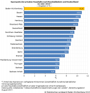 Die privaten Haushalte können ihr Einkommen entweder konsumieren oder sparen. Das nicht für Konsumzwecke verwendete verfügbare Einkommen zuzüglich der Zunahme der betrieblichen Versorgungsansprüche stellt das Sparen der privaten Haushalte dar. Im Jahr 2016 haben die privaten Haushalte im Südwesten mit insgesamt gut 30,6 Mrd. Euro 2,1 % mehr gespart als im Vorjahr. Dies entsprach einer Pro-Kopf-Ersparnis von über 2 800 Euro. Die Sparquote, der Anteil des Sparvolumens am verfügbaren Einkommen (zuzüglich der Zunahme betrieblicher Versorgungsansprüche), belief sich hierzulande 2016 auf 11,4 %. Im bundesweiten Vergleich war Baden-Württemberg damit auch 2016 das sparfreudigste Bundesland. Auf den Plätzen zwei und drei folgten Bayern und Hessen mit einer Sparquote von 10,9 % bzw. 10,7 %.