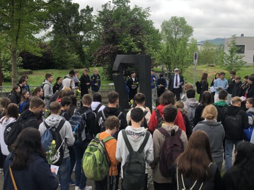 Dies nahm der ehemalige Klinikseelsorger und Religionslehrer an der Kraichgau-Realschule, Herr Pfarrer i.R. Dr. Coors, zum Anlass, um den Schülerinnen und Schülerinnen die Unmenschlichkeit der Ermordung von behinderten Menschen in der Zeit des Nationalsozialismus zu verdeutlichen. Die Schülerinnen und Schüler lasen die vierzehn Namen des ersten Transportes vor, die von der SS abtransportiert wurden und denen noch 200 Sinsheimer Bewohner der Kreispflege in die Gaskammern von Grafeneck folgen sollten. In der Gedenkfeier wurde deutlich, es niemanden zusteht, über das Recht zu leben zu entscheiden und dass jedes Leben wertvoll und einzigartig ist. Für die Religionsfachschaft der Kraichgau-Realschule sprach Barbara Grom, die die goldene Regel der Weltreligionen: „Behandle andere so, wie du von ihnen behandelt werden willst.“ mit Unterstützung aus den Klassen vorstellte. Die Schülerinnen und Schüler zogen dann vom Casino zum heutigen Betreuungszentrum und legten am Denkmal zum Gedenken an die getöteten Sinsheimer Heimbewohnerinnen und Heimbewohner Blumen nieder.