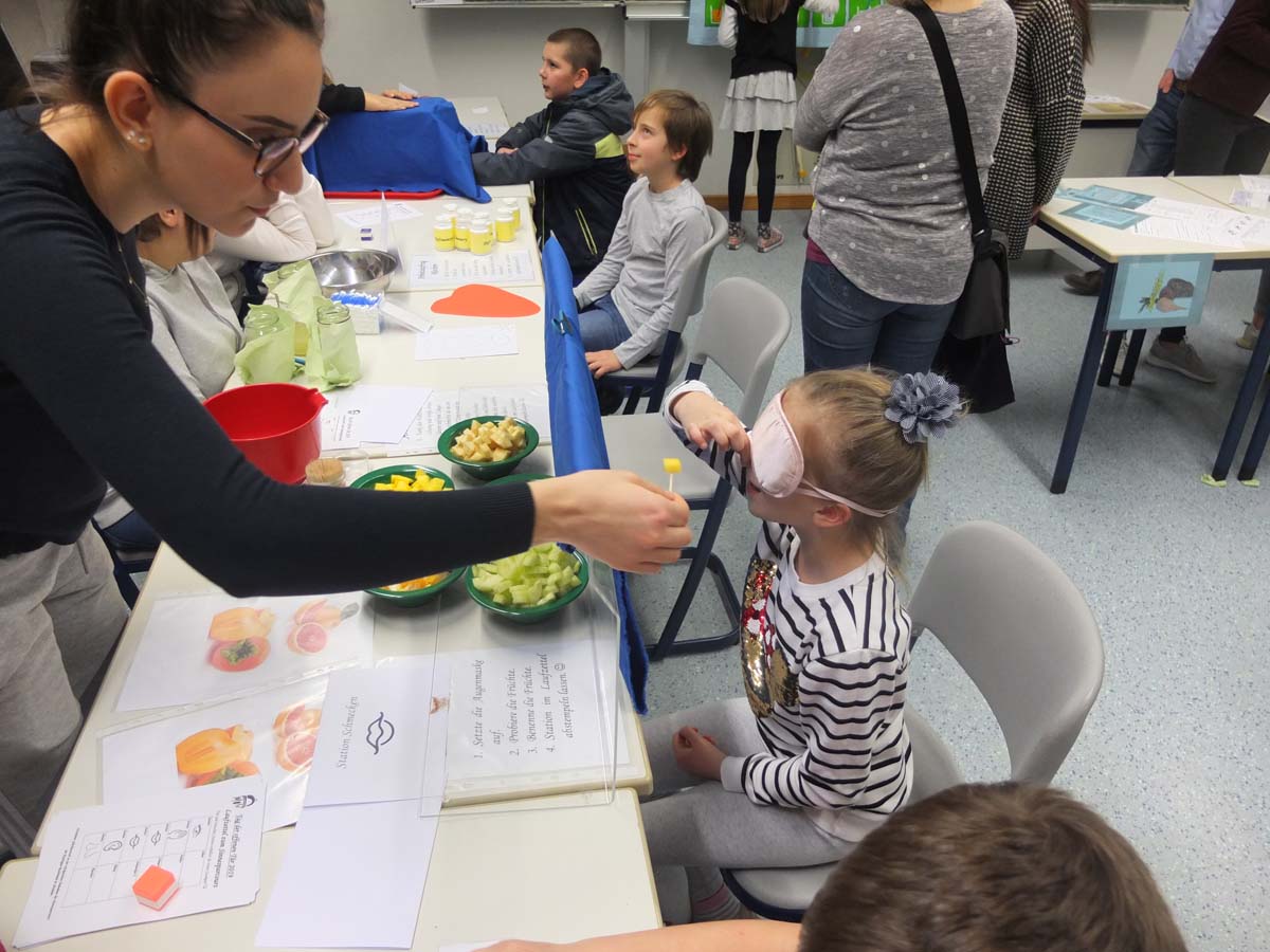 Den jungen Besucherinnen und Besucher war es möglich, Schülerinnen und Schüler aller Klassen Fragen zu stellen, ihren Alltag kennen zu lernen oder auch selbst kleinere Experimente aus dem Schulalltag durchzuführen. Viele erkannten, dass das Fach Alltag, Ernährung und Soziales aus viel mehr besteht, als aus Kochen und Nähen. Einige erhielten an diesem Abend zudem ihre erste „richtige“ Englischstunde oder wurden vor mathematische Probleme gestellt, die aber mit Bravour und der tollen Unterstützung der unterrichtenden Kolleginnen und Kollegen, gemeistert wurden. Ein Highlight, neben all den vielen Mitmachmöglichkeiten, war, dass das Mensateam, das allen, die gekommen waren, kleine Häppchen anbot. Der Freundeskreis und der Elternbeirat versorgten, dazu passend, die Gäste mit erfrischenden Getränken. Frau Bastian von der Schulbibliothek stellte alle Möglichkeiten der Bibliothek vor und stand den ganzen Abend mit Rat und Tat zur Seite.