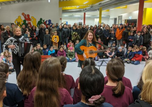In der Mensa wurden die Gäste vom Mensateam mit Häppchen des Caterers Apetito begrüßt. Die Singklassen unter der Leitung von Heike Witt und Elena Buchalla zeigten zum Auftakt ihr Können und begeisterten mit Gesang und Tanz die fast zweihundert Besucherinnen und Besucher. Konrektorin Sabine Lager erklärte die Einteilung der Besuchergruppen und schickte die Gruppen mit Schülerinnen und Schülern der Klasse 10a auf den von der Realschule gestalteten Parcours.
