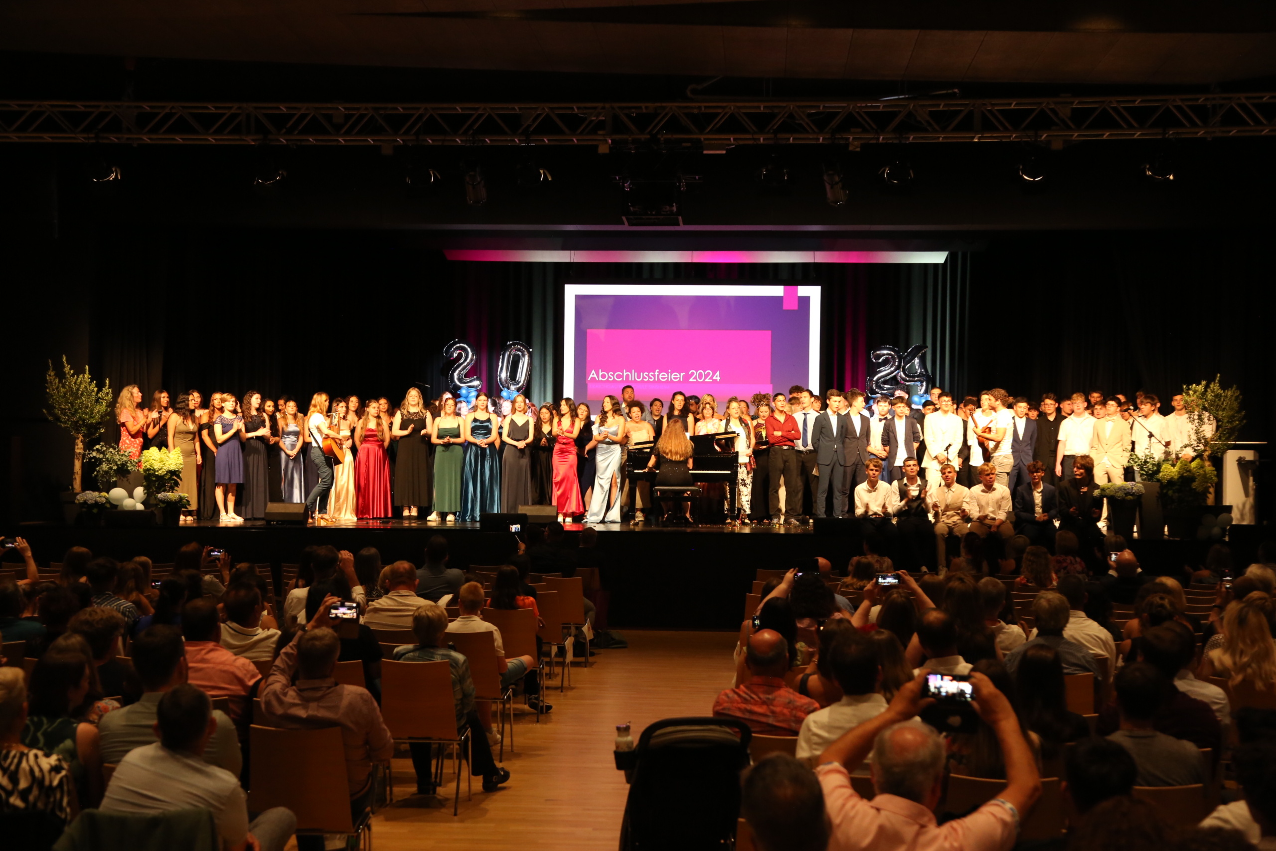 Die Abschlussklassen erhielten aus den Händen der Klassenlehrerinnen und Klassenlehrer Catharina Schantze, Selina Schneider, Stefanie Löffler, Christian Bader und Florian Wäckerle ihre Zeugnisse. Die Abschlussfeier wurde von herausragenden musikalischen Beiträgen umrahmt. Die Singklassen unter der Leitung von Heike Witt eröffneten stimmgewaltig den Abend. Leonie-Soraya Kliem sang ein bejubeltes Solo, wobei sie von Niko Geier am Klavier begleitet wurde. Eine Akustik-Band aus der Klasse 10a unter Leitung von Simone Gantert begeisterte ebenso das Publikum. Die Tanzeinlagen kamen von der Klasse 10b unter der Leitung von Selina Schneider und den Sportgruppen der 10. Klassen unter der Leitung von Anke Hagner, die von einer Mädchengruppe aus den siebten Klassen unterstützt wurden. Die Klasse 9e hatte sich etwas Besonderes ausgedacht und überraschte das Publikum mit einem Lehrer-Schüler-Quiz.