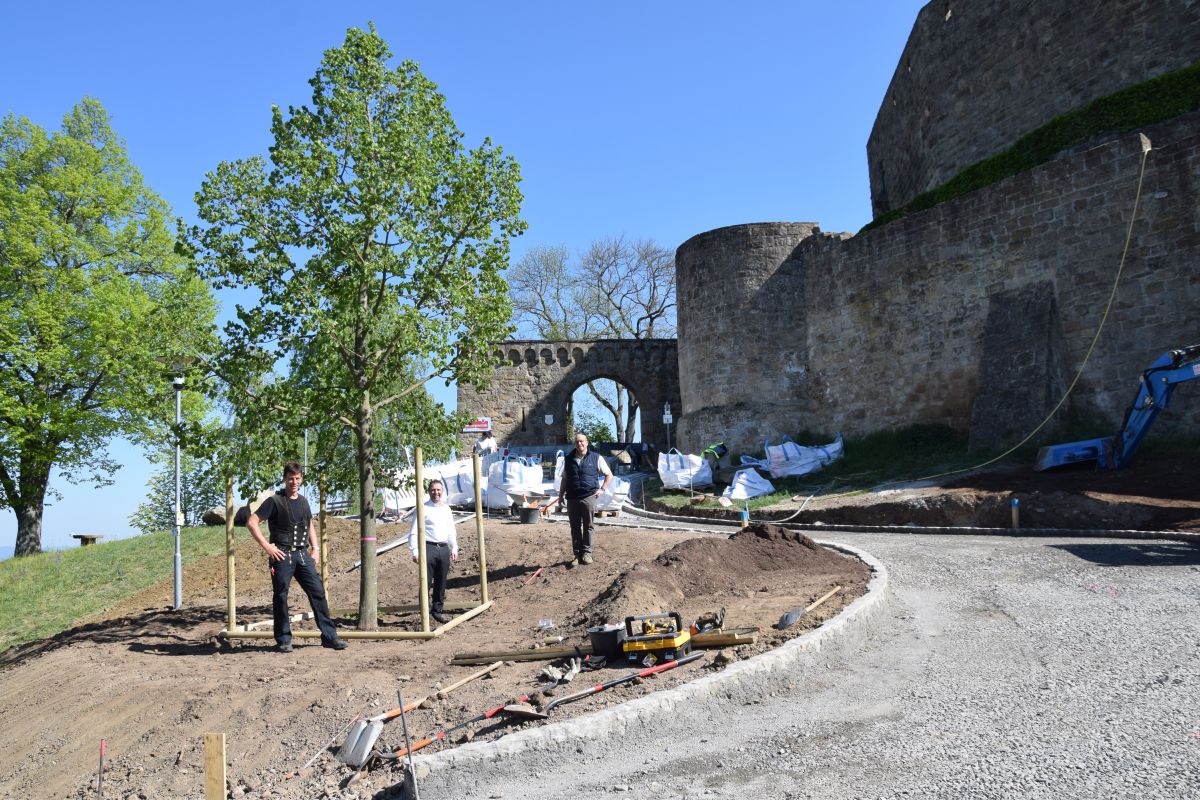 (zg) Der Weg zur Burg Steinsberg in Weiler schlängelt sich steil hinauf zum Eingangstor. Die Sanierungsarbeiten der in die Jahre gekommenen Wege innerhalb der Burg und rund um den „Kompass des Kraichgaus“ sind weit fortgeschritten. Seit vergangenem Sommer ist die Firma Riedlberger bei den Bauarbeiten im Einsatz. Rund um die Burg wurde und wird begrünt, der Weg mit Muschelkalkpflaster gepflastert. Geplant wird das Projekt vom freien Garten- und Landschaftsarchitekten Michael Epple. Direkt vorm Burgtor steht in der Wegbiegung nun eine Krim-Linde, die Michael Epple der Stadt gespendet hat, und die künftig Schatten spenden soll.