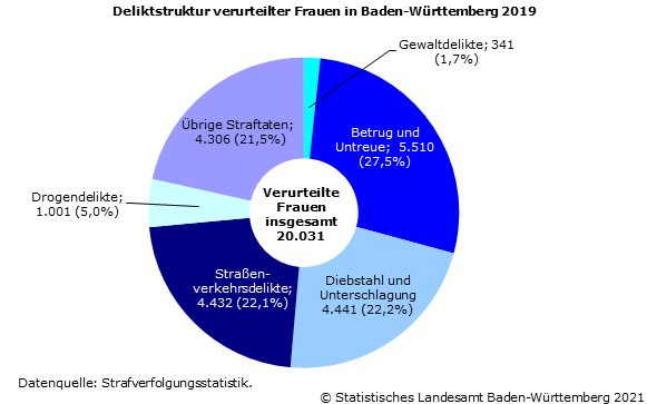 Im Jahr 2019 entfielen 15 725, also mehr als drei Viertel der insgesamt 20 031 Verurteilungen gegen Frauen, auf fünf Straftatengruppen. Dies waren Betrug und Untreue (27,5 %), Diebstahl und Unterschlagung (22,2 %), Straßenverkehrsdelikte (22,1 %), Drogendelikte (5 %) und Gewaltdelikte (1,7 %).