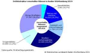 Unter den 109 847 Personen, die im Jahr 2019 in Baden-Württemberg vor Gericht schuldig gesprochen wurden, waren 20 031 Frauen. Mit einem Anteil von 18,2 % war somit lediglich knapp jede fünfte verurteilte Straftat von einer Frau. Dies teilte das Statistische Landesamt nach einer Auswertung der Strafverfolgungsstatistik 2019 mit1.