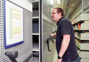 Eng verbunden mit dem Archiv ist die Registratur. Dort werden Akten gelagert, die für das Tagesgeschäft von den Sachbearbeitern nicht mehr benötigt werden, auf denen jedoch noch Aufbewahrungspflichten liegen. Nach Ablauf der recht unterschiedlichen Fristen werden die Akten, die nicht aus rechtlichen Gründen dauerhaft aufbewahrt werden müssen, dem Archiv zur Übernahme angeboten. „Unsere Aufgabe als Archivare des Rhein-Neckar-Kreises ist es, das umfangreiche Material, das uns erreicht, zu sichten und dann zu entscheiden, was davon für die Nachwelt erhalten bleiben soll“, skizziert Kreutz eine wichtige Arbeit seines Teams. Zurzeit verwahrt die Registratur rund 9000 lfm Schriftgut.
