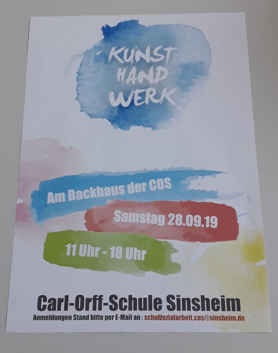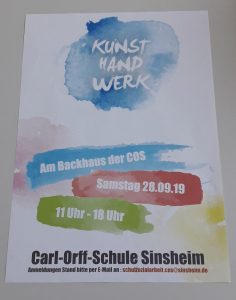 Am Samstag, den 28. September 2019, findet von 11:00-18:00 Uhr ein Kunsthandwerkermarkt rund um das Backhaus der Carl-Orff-Schule statt.