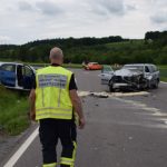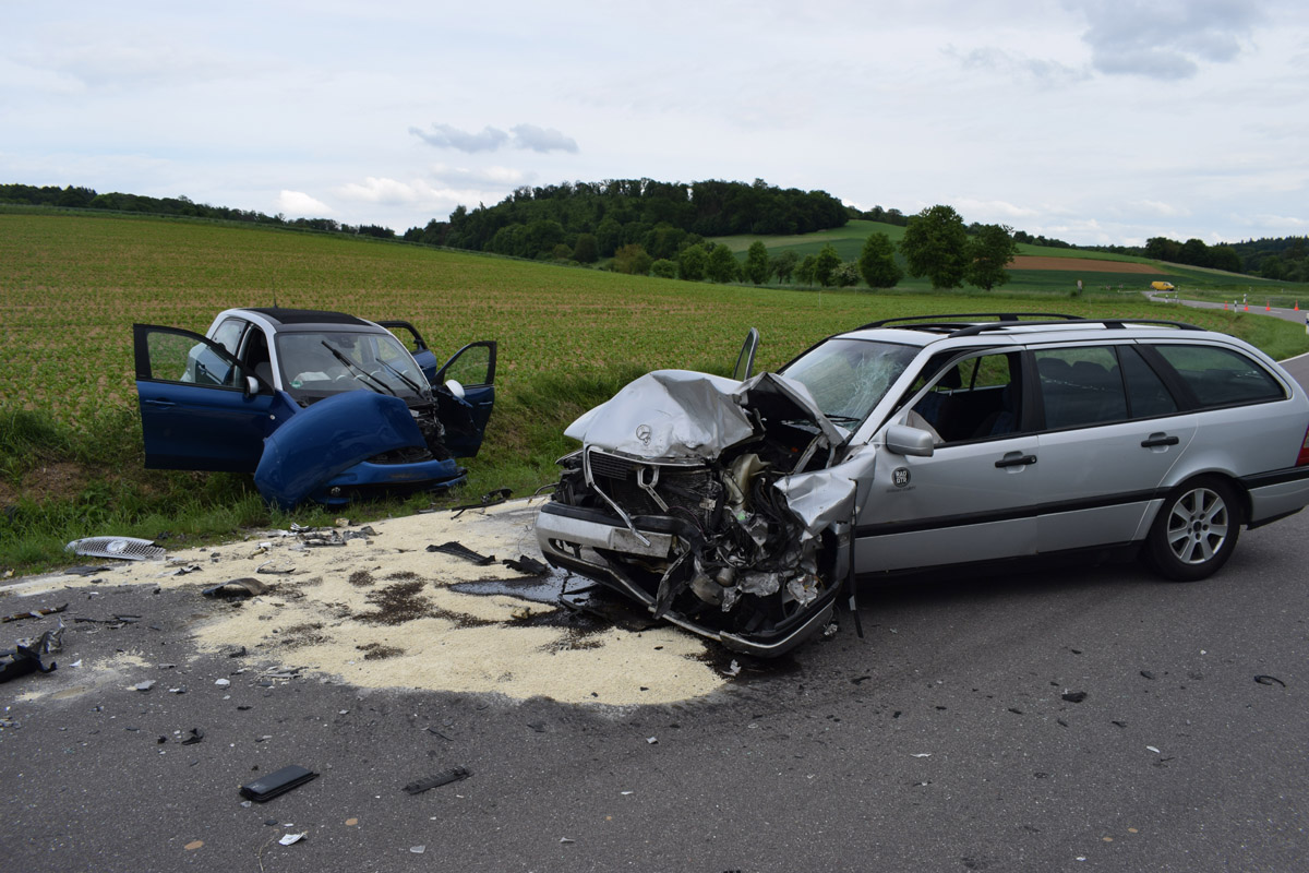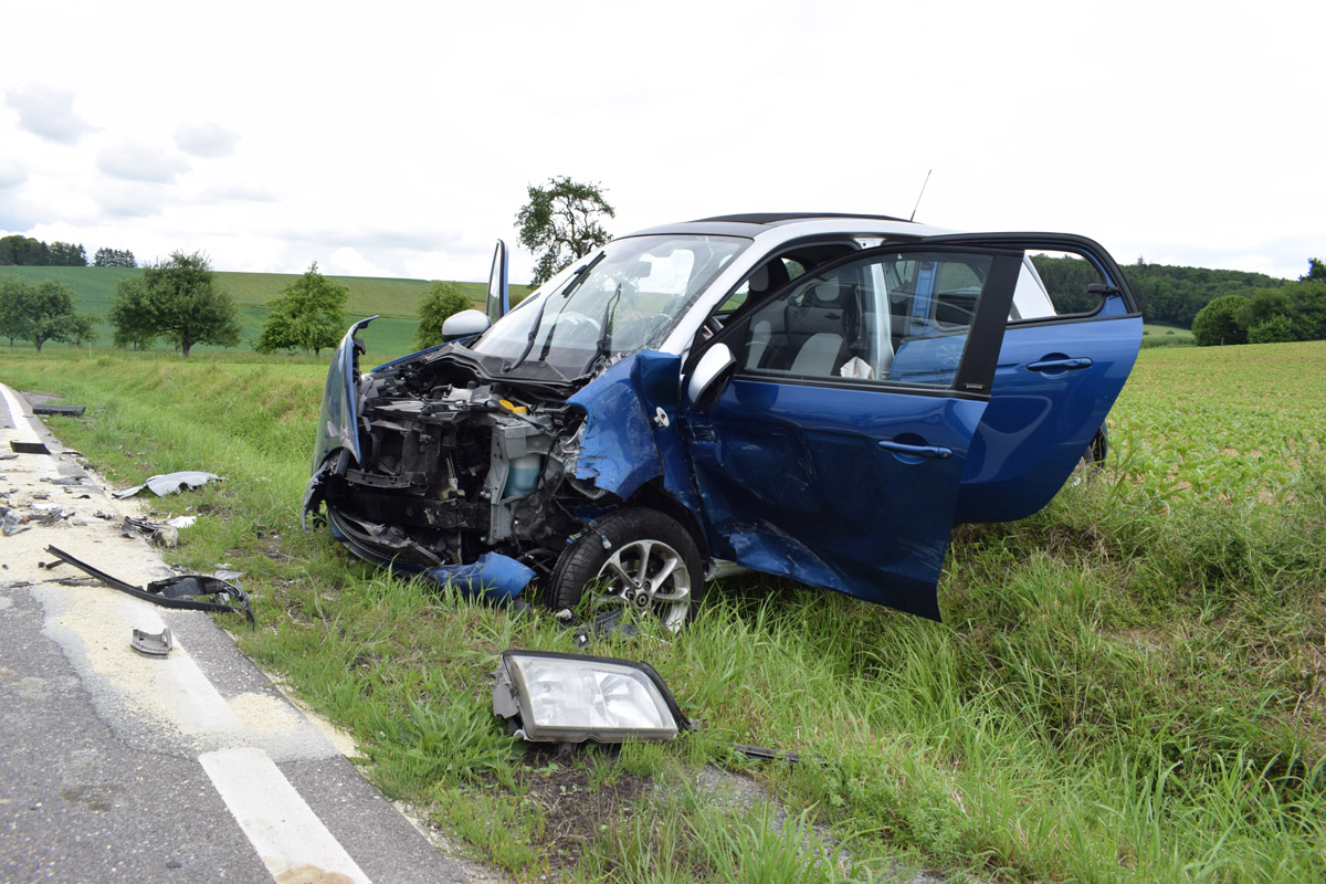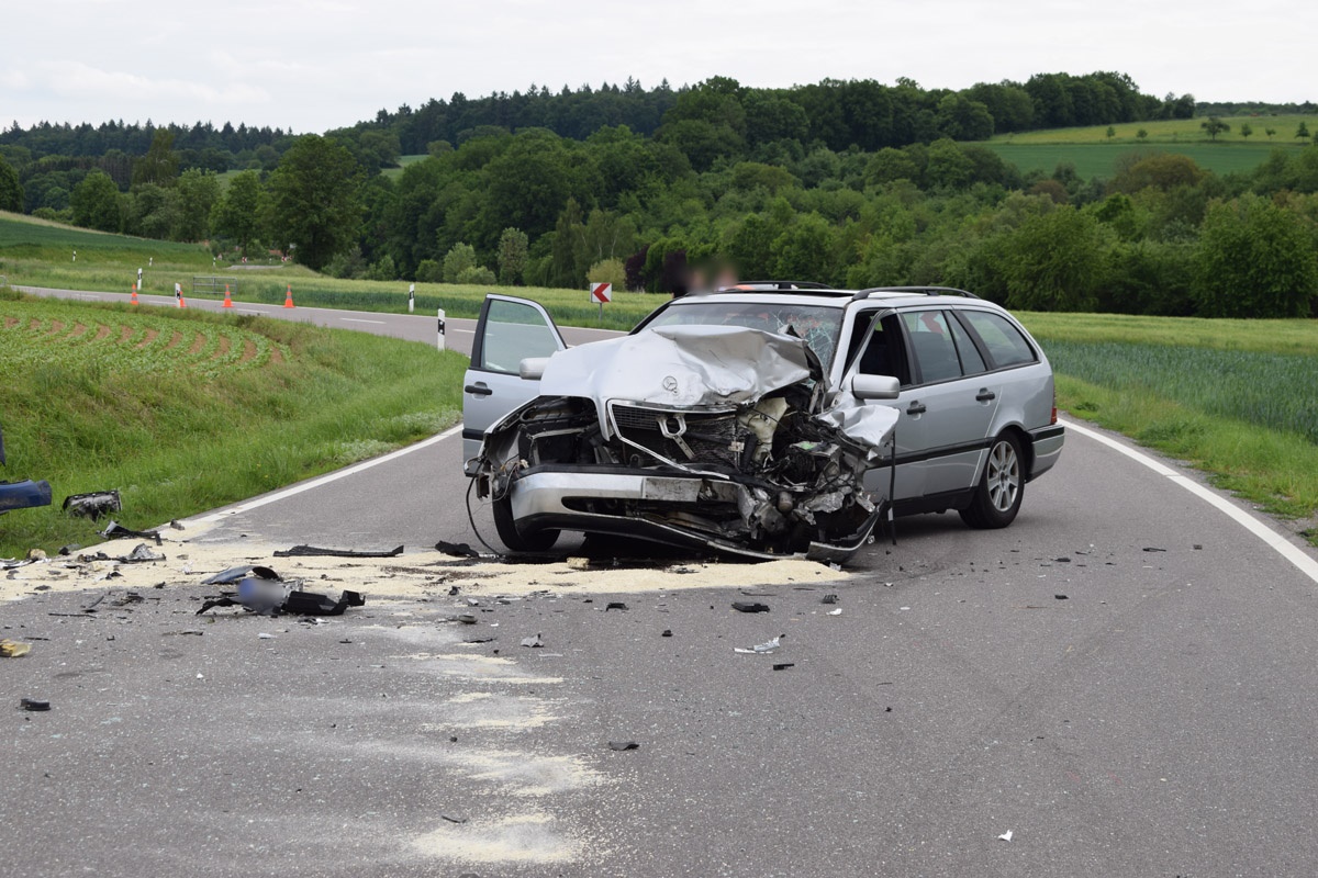 L530 / Helmstadt-Bargen. (pol) Am Montagnachmittag, gegen 16.45 Uhr, befuhr eine 23-jährige Frau mit ihrem Smart die L530 von Wollenberg kommend in Richtung Bargen. In einer langgezogenen Linkskurve kam ihr ein 18-jähriger Mercedes-Fahrer entgegen. Aus bislang unbekannter Ursache geriet der 18-Jährige auf die Gegenfahrbahn und kollidierte frontal mit der 23-Jährigen. Durch den Zusammenstoß drehte sich der Mercedes und kam mittig auf der Fahrbahn zum Stillstand. Der Smart wurde in Fahrtrichtung nach rechts von der Fahrbahn abgewiesen und landete im Straßengraben. Hinter dem Mercedes fuhr ein 18-jähriger junger Mann mit seinem VW. Um eine Kollision mit den beiden Unfallfahrzeugen zu vermeiden wich er nach rechts aus, überfuhr einen Straßenpfosten und kam im angrenzenden Acker zum Stillstand. Der Unfallverursacher wurde lediglich leicht, die Fahrerin des Smarts schwer, jedoch nicht lebensgefährlich verletzt. Sie kam mit einem Rettungswagen in ein Krankenhaus. Der VW-Fahrer blieb unverletzt. Der Mercedes wie auch der Smart wurden total beschädigt und mussten abgeschleppt werden. Es entstand ein geschätzter Sachschaden von insgesamt 17.000.- Euro, davon ca. 1.000.- Euro an dem VW. Vor Ort befanden sich zwei RTW, ein Notarzt, die Freiwilligen Feuerwehren aus Helmstadt, Flinsbach und Bargen mit 28 Einsatzkräften sowie ein Rettungshubschrauber. Der Rettungshubschrauber wurde vorsorglich alarmiert, musste jedoch keinen der Beteiligten transportieren. Während der Verkehrsunfallaufnahme musste die L530 im Bereich der Unfallörtlichkeit bis ca. 18.50 Uhr vollgesperrt werden. Der Verkehr wurde örtlich umgeleitet. Es ergaben sich nur geringfügige Verkehrsbeeinträchtigungen.