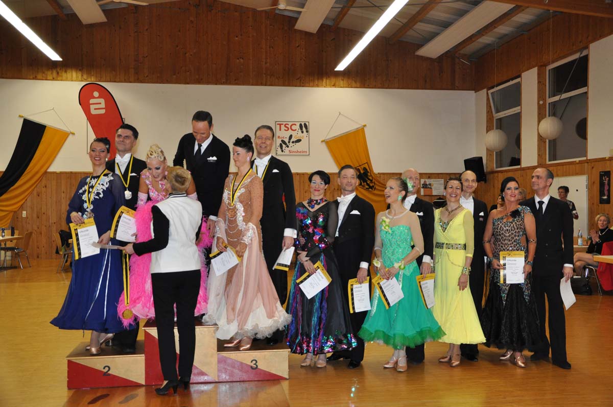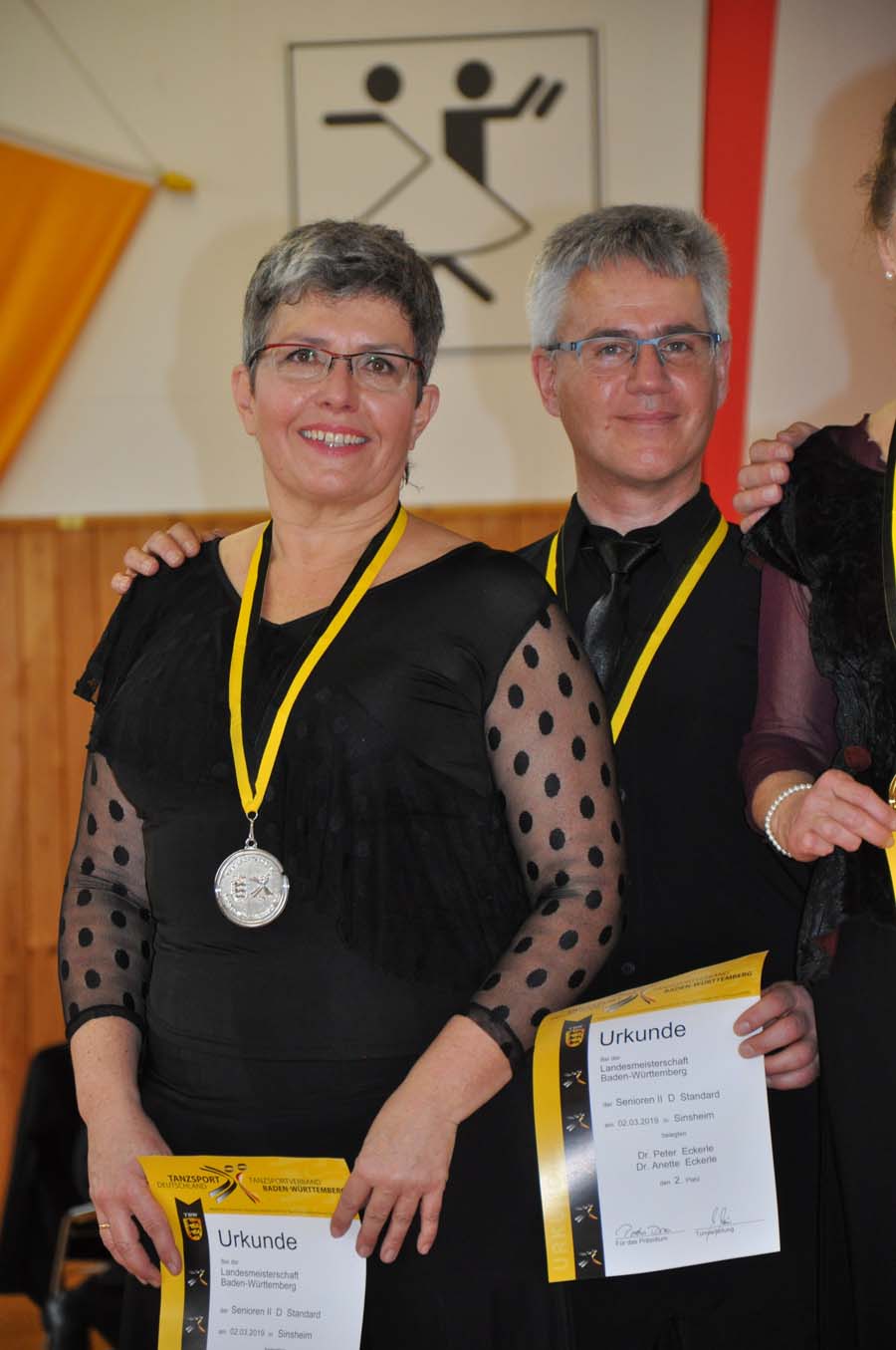 Der TSC Rot-Gold Sinsheim wurde von zwei Paaren vertreten. In der Senioren II D Klasse startete das Paar Dr. Peter und Dr. Anette Eckerle. Sie freuten sich über ihren 2. Platz und damit den Titel des Vize-Landesmeisters. In der Senioren II S Klasse, der höchsten Leistungsklasse, starteten 25 Paare, was die größte Gruppe an diesem Tag darstellte und Tanzen auf höchstem Niveau zeigte. Alexander Hick und Petra-Alexandra Leßmann belegten in dieser jüngeren Altersklasse einen hervorragenden 6. Platz. Landesmeister 2019 der Senioren II S Klasse wurden Bernhard und Sonja Fuss vom TTC Rott-Weiß Freiburg. Die Siegerehrungen führte Petra Dres vom Tanzsportverband Baden-Württemberg (TBW) durch. Dafür sowie für ihr fachkundiges Engagement bedankte sich der Präsident des Tanzsportclubs, Reinhold Jablonka, bei ihr.