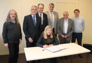 (Foto Landratsamt Rhein-Neckar-Kreis): Gemeinsame Aktion gegen die Rotstift-Politik bei der Klinikversorgung des Landes: v.l.n.r.: Ralf Frühwirt (Bündnis 90/Die Grünen), Landrat Stefan Dallinger (CDU), Ralf Göck (SPD), Claudia Felden (FDP), Hans Zellner (Freie Wähler), Bruno Sauerzapf (CDU) und Dr. Edgar Wunder (Die Linke) unterzeichnen das gemeinsame Schreiben an Ministerpräsidenten Winfried Kretschmann.