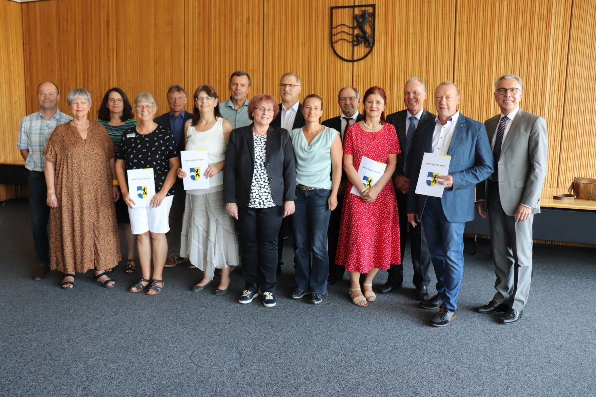v.l.n.r. Heidemarie Böhmer-Songo, beschäftigt beim Jugendamt, wohnhaft in Mannheim (25 Jahre im öffentlichen Dienst), Ingrid Karaalp, beschäftigt beim Jugendamt, wohnhaft in Wiesloch (25 Jahre im öffentlichen Dienst), Sieglinde Kraft, beschäftigt beim Gesundheitsamt, wohnhaft in Oftersheim (25 Jahre im öffentlichen Dienst), Robert Lang, beschäftigt beim Kreisforstamt, wohnhaft in St. Leon-Rot (40 Jahre im öffentlichen Dienst), Solveig Messner, beschäftigt beim Sozialamt, wohnhaft in Wiesenbach (25 Jahre im öffentlichen Dienst), Dr. Sebastian Eick, beschäftigt beim Kreisforstamt, wohnhaft in Schwetzingen (40 Jahre im öffentlichen Dienst), Hannelore Schroth, beschäftigt beim Jobcenter Rhein-Neckar-Kreis, wohnhaft in Neckarbischofsheim (40 Jahre im öffentlichen Dienst), Jürgen Häuselmann, beschäftigt bei der GRN gGmbH, wohnhaft in Angelbachtal (40 Jahre im öffentlichen Dienst), Heike Seib, beschäftigt beim Amt für Flurneuordnung, wohnhaft in Ubstadt-Weiher (25 Jahre im öffentlichen Dienst), Richard Hellebrand, beschäftigt beim Amt für Flurneuordnung, wohnhaft in Nußloch (40 Jahre im öffentlichen Dienst), Mioara Emerich, beschäftigt beim Amt für Gewerbeaufsicht und Umweltschutz, wohnhaft in Mannheim (25 Jahre im öffentlichen Dienst), Erich Diefenbacher, beschäftigt beim Amt für Gewerbeaufsicht und Umweltschutz, wohnhaft in Waibstadt (40 Jahre im öffentlichen Dienst) und Theophil Kirsch, beschäftigt beim Jugendamt, wohnhaft in Sinsheim (40 Jahre im öffentlichen Dienst).