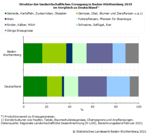 Die pflanzliche Erzeugung trug im Jahr 2019 mit über 2,7 Mrd. Euro mehr als die Hälfte (55 %) zum Produktionswert der Landwirtschaft im Südwesten bei. Neben den Sonderkulturen, wie u. a. Obst, Gemüse und Weinbau ist der Getreideanbau mit einem Produktionswert von 600 Mill. Euro der wichtigste pflanzenbauliche Produktionszweig. Insgesamt nahm der Produktionswert der pflanzlichen Erzeugung 2019 um 232 Mill. Euro oder 9,3 % gegenüber dem Vorjahr zu. Bei den bedeutenden Kulturen waren die größten Zuwächse bei Kartoffeln (+39,6 %), Getreide (+15,7 %) und Zuckerrüben (+10,7 %) zu verzeichnen. Rückläufig waren die Produktionswerte hingegen bei Obst (−26,2 %), Wein (−14,1 %) und Ölsaaten (−15,6 %). Den höchsten Zuwachs im pflanzlichen Bereich erzielten die Futterpflanzen mit +53,0 %, was aber z. T. auch auf den außergewöhnlich geringen Wert im Vorjahr zurückzuführen ist.
