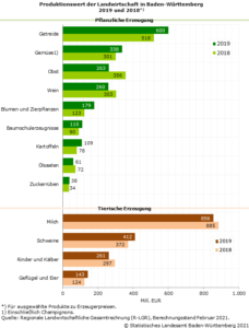 Als Saldo aus Produktionswert und Vorleistungen ergibt sich die Bruttowertschöpfung der Landwirtschaft. Diese nahm 2019 um über 19,8 % auf knapp 1,9 Mrd. Euro zu (Vorjahr: 1,6 Mrd. Euro). Verglichen mit der baden-württembergischen Wirtschaftsleistung insgesamt in Höhe von knapp 471 Mrd. Euro im Jahr 2019, beläuft sich der Anteil der Landwirtschaft auf weniger als ein % (0,4 %). Im Durchschnitt aller Länder lag der Anteil 2019 bei 0,7 %.