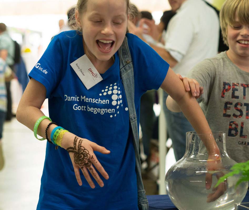 „Überhaupt war die Ausstellung eine Wucht!“, sagte Lydia, eine 43-jährige Besucherin aus Erfurt. Sie spendet schon seit Jahren für die DMG und freute sich, mit ihren Missionaren ins Gespräch zu kommen. Die Vorstellung der Projekte war kreativ, alles zum Mitmachen. Martin Hornfischer, der Eskimojugendliche in Alaska fördert, prüfte die Kältetauglichkeit der Gäste: Sie sollten 30 Sekunden ihre Hand in Eiswasser tauchen. Eine Missionsärztin maß Blutdruck. Unter der riesigen arabischen Kalligrafie eines Bibelverses malten Gäste Henna. Andere bauten Lego und übten Sandmalerei. Faszinierend, in welcher Vielfalt die DMG Glauben anschaulich machte.