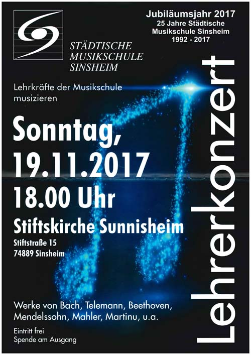 (zg) Lehrerinnen und Lehrer der Städt. Musikschule geben am Sonntag, 19. November 2017 um 18.00 Uhr ein Lehrerkammerkonzert. Aus Anlass des 25jährigen Jubiläumsjahres findet das Konzert in der Kirche des Stift Sunnisheim statt.