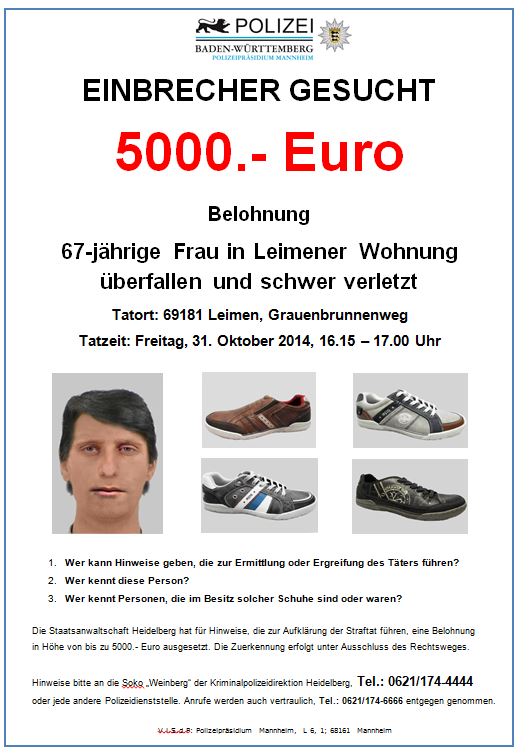 Die Staatsanwaltschaft Heidelberg hat eine Belohnung in Höhe von bis zu 5.000.- Euro für Hinweise ausgesetzt, die zur Ermittlung oder Ergreifung des Täters führen.