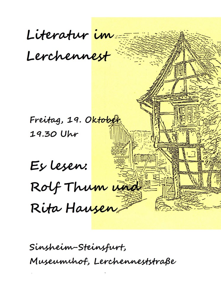 (cr) In dem wunderschönen Museumshof des Lerchennestes in Sinsheim-Steinsfurt veranstalten die Freunde des Lerchennestes e.V. am Freitag den 19.10.2012 um 19.30 Uhr eine Lesung. Rolf Thum liest aus einer Zeitreisegeschichte und Rita Hausen aus ihrem Roman über die Jugend Friedrichs des Großen „Ein ungeratener Sohn“. Alle Interessierten sind recht herzlich eingeladen.