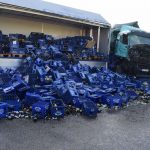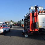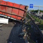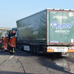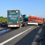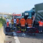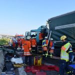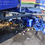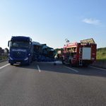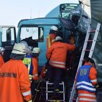(zg) Ein schwerer LKW-Unfall ereignete sich am frühen Montagmorgen gegen 06.30 Uhr auf der A6 zwischen den Anschlussstellen Sinsheim-Steinsfurt und Sinsheim-Süd in Höhe des Stadions. Nach derzeitigem Stand musste der Fahrer eines Getränkelasters wegen einer Verkehrsstockung anhalten. Ein mit Müll beladener Hängerzug erkannte den Rückstau und bremste ebenfalls ab. Ein mit Farbe beladener LKW übersah jedoch, aus bislang ungeklärter Ursache den Rückstau und schob den Hängerzug auf den Getränkelaster. Bei dem Zusammenprall brach bei dem Hängerzug die Achse und die beiden mit Müll beladenen Container verkeilten sich auf der Fahrbahn. Das Führerhaus des Unfallverursachers wurde bei dem Aufprall bis auf wenige Zentimeter zusammengeschoben. Er musste von der Feuerwehr Sinsheim mit hydraulischem Rettungsgerät aus seinem bis auf ca. 40cm zusammengeschobenen Führerhaus gerettet werden. Nach einer notärztlichen Stabilisierung musste er mittels Rettungshubschrauber in eine Spezialklinik geflogen werden. Die verlorene Ladung und die ausgelaufenen Stoffen müssen nun vom THW umgeladen werden. Die Bergungsarbeiten werden bis in den Nachmittag andauern.