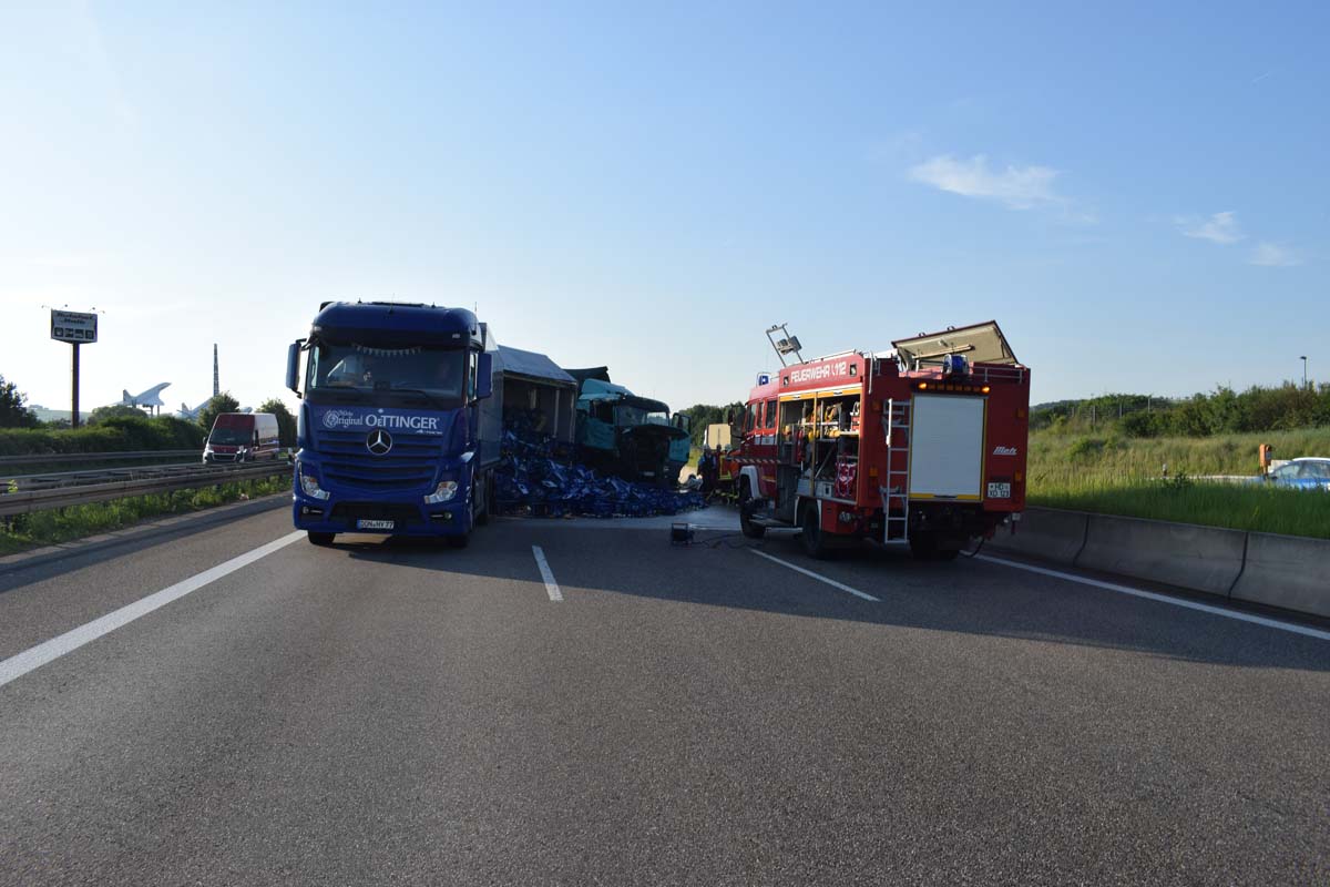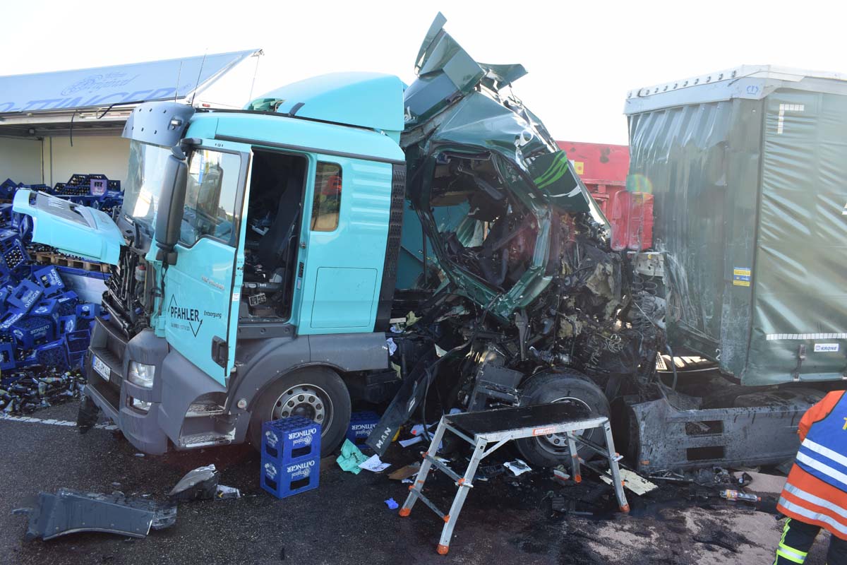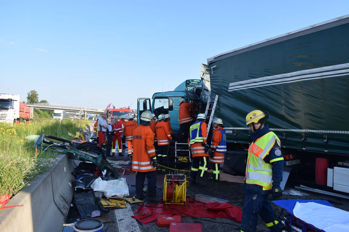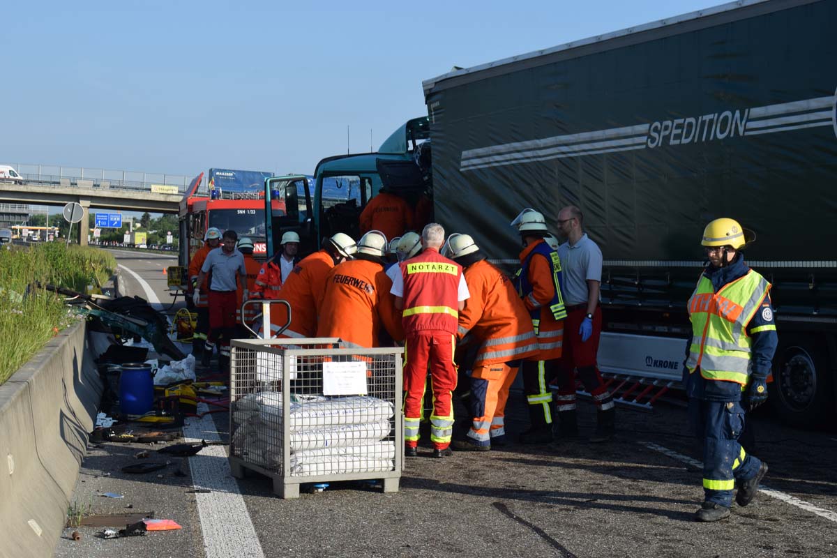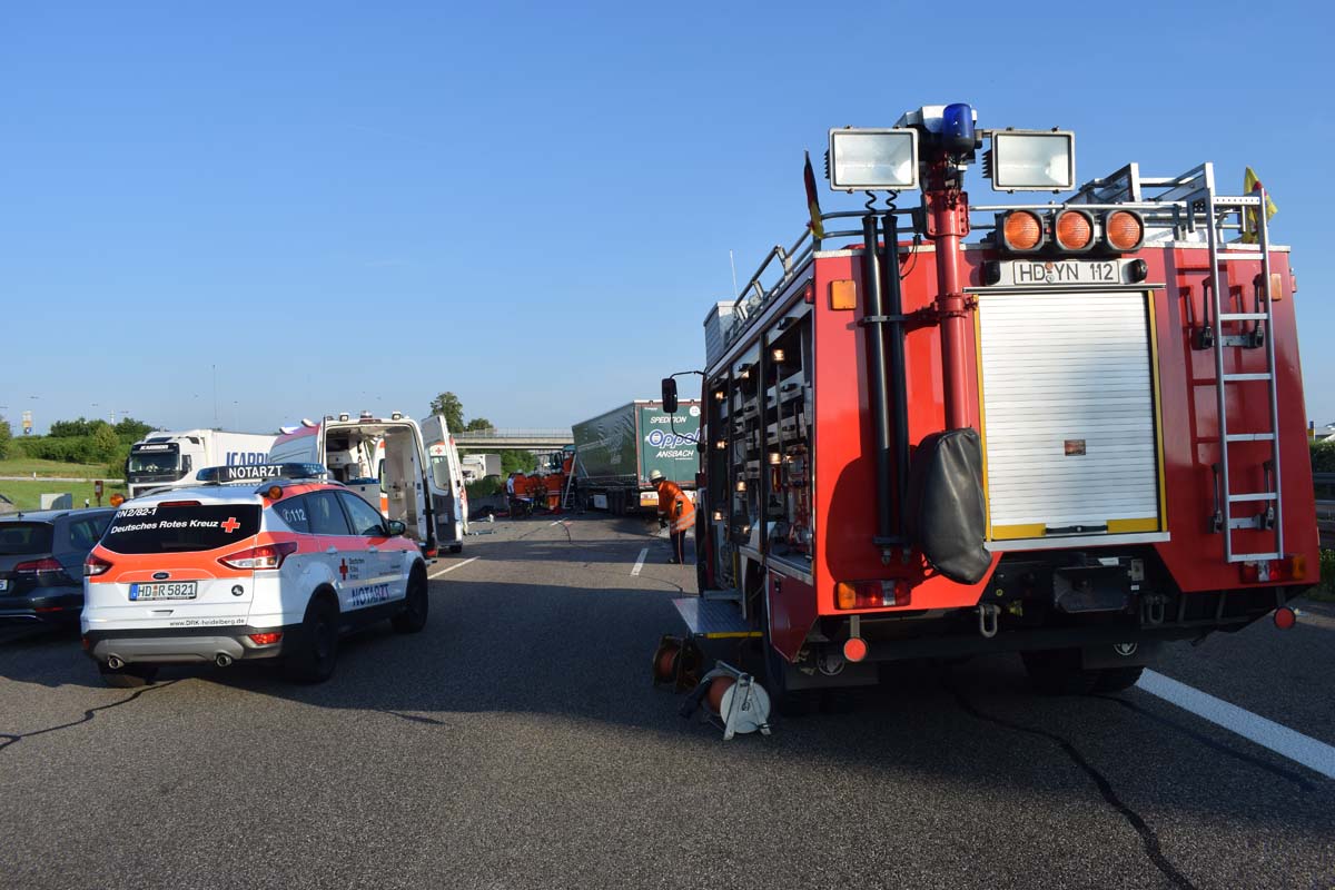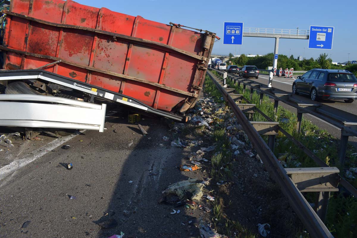 (zg) Ein schwerer LKW-Unfall ereignete sich am frühen Montagmorgen gegen 06.30 Uhr auf der A6 zwischen den Anschlussstellen Sinsheim-Steinsfurt und Sinsheim-Süd in Höhe des Stadions. Nach derzeitigem Stand musste der Fahrer eines Getränkelasters wegen einer Verkehrsstockung anhalten. Ein mit Müll beladener Hängerzug erkannte den Rückstau und bremste ebenfalls ab. Ein mit Farbe beladener LKW übersah jedoch, aus bislang ungeklärter Ursache den Rückstau und schob den Hängerzug auf den Getränkelaster. Bei dem Zusammenprall brach bei dem Hängerzug die Achse und die beiden mit Müll beladenen Container verkeilten sich auf der Fahrbahn. Das Führerhaus des Unfallverursachers wurde bei dem Aufprall bis auf wenige Zentimeter zusammengeschoben. Er musste von der Feuerwehr Sinsheim mit hydraulischem Rettungsgerät aus seinem bis auf ca. 40cm zusammengeschobenen Führerhaus gerettet werden. Nach einer notärztlichen Stabilisierung musste er mittels Rettungshubschrauber in eine Spezialklinik geflogen werden. Die verlorene Ladung und die ausgelaufenen Stoffen müssen nun vom THW umgeladen werden. Die Bergungsarbeiten werden bis in den Nachmittag andauern.