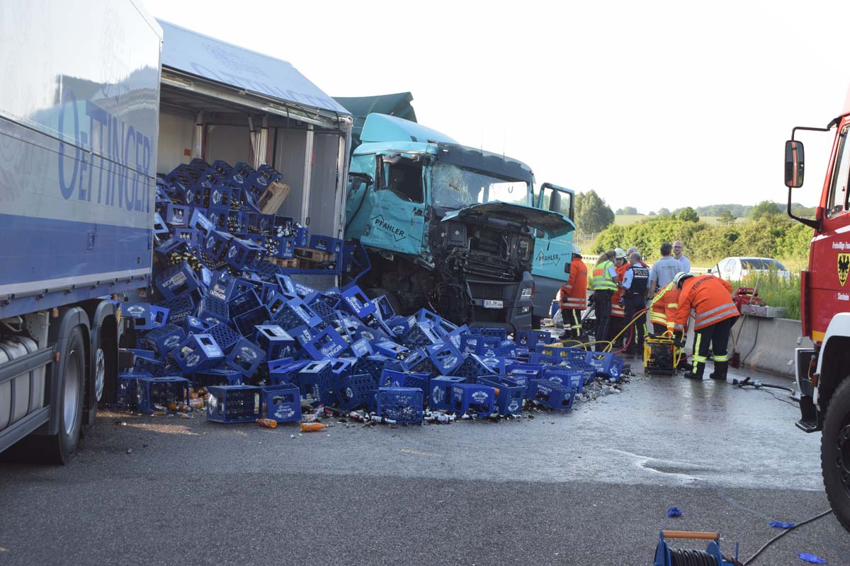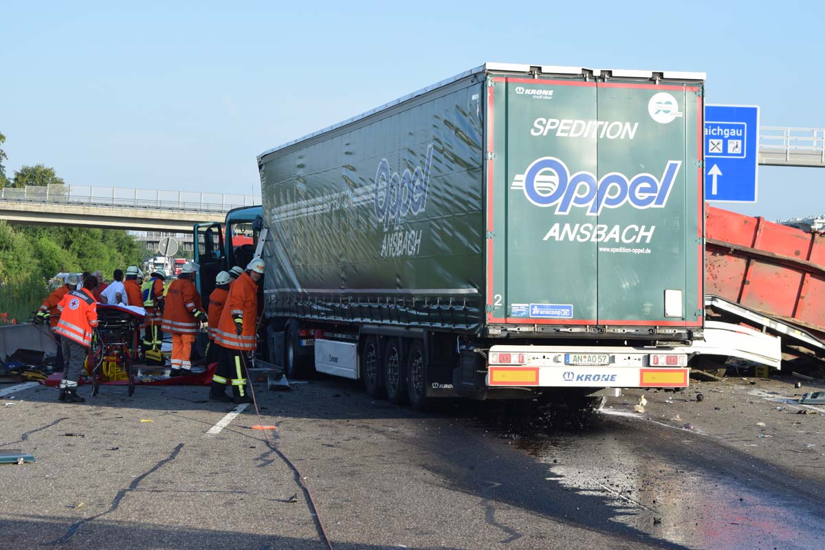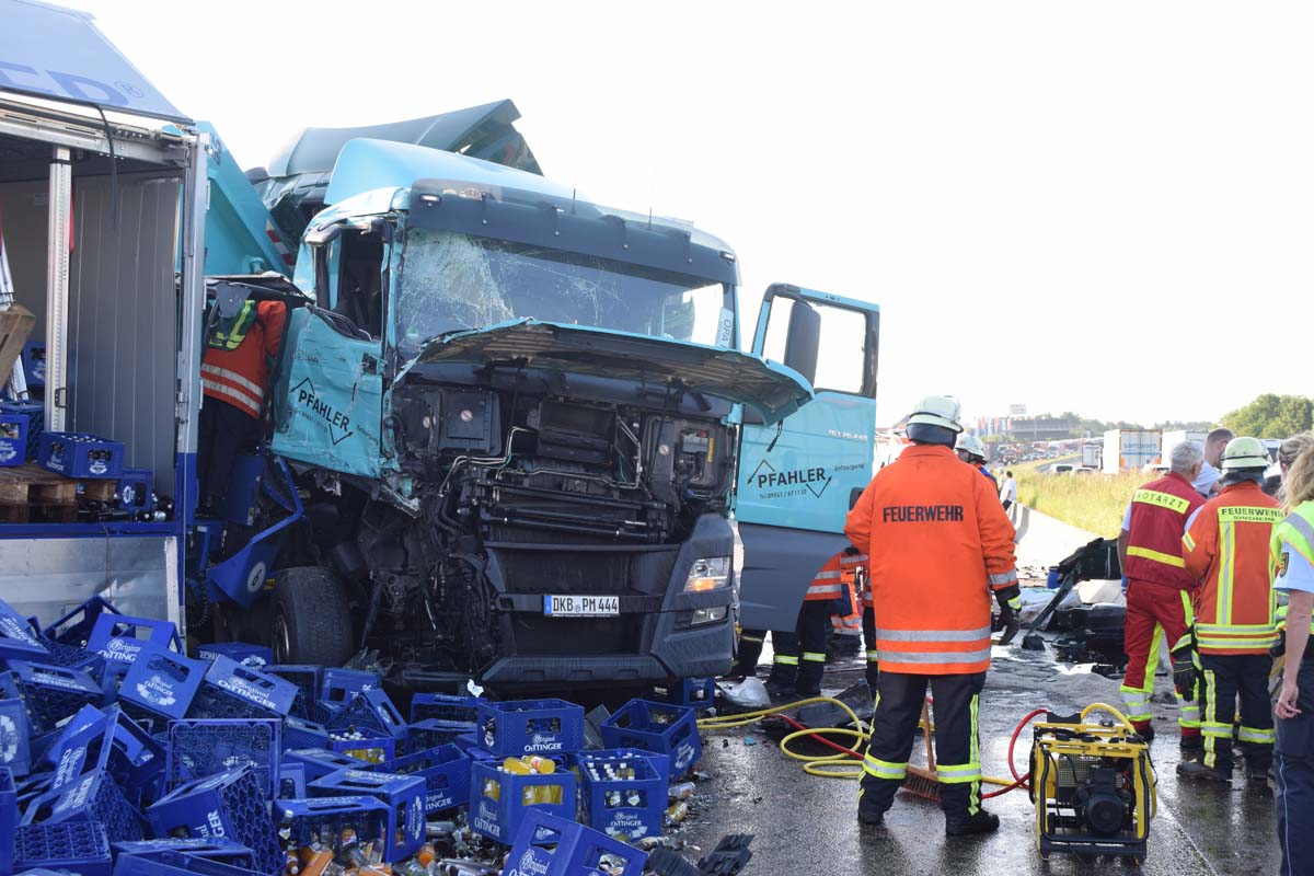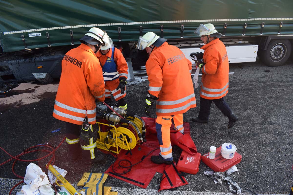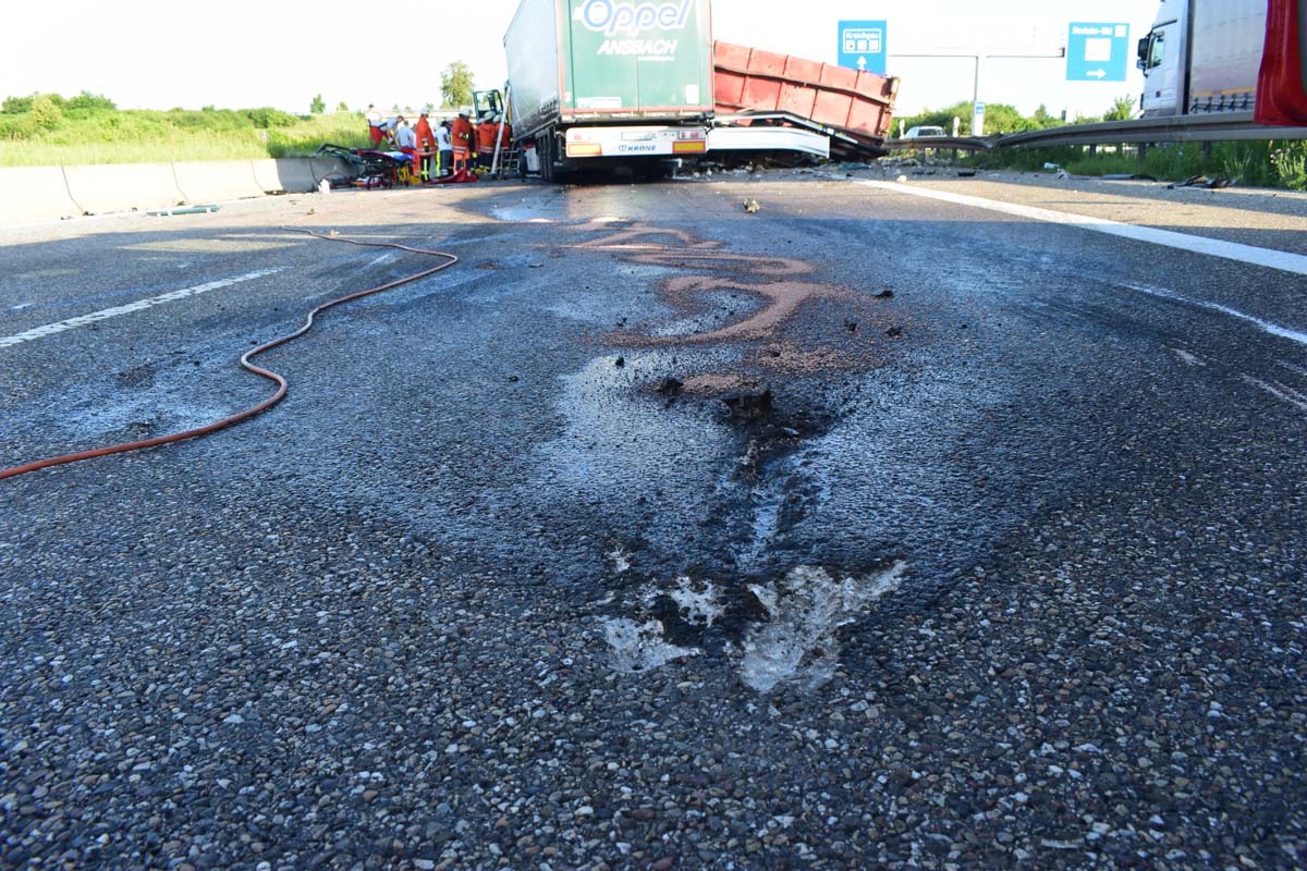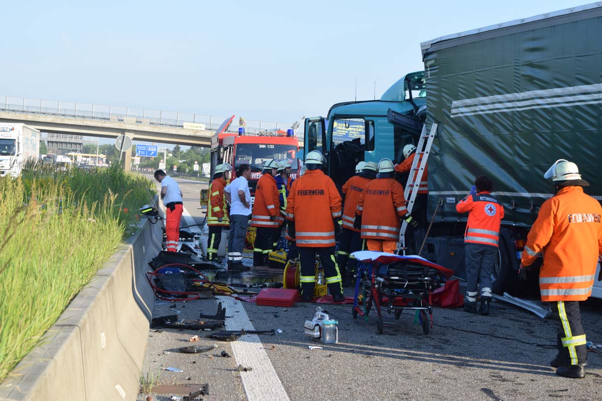 (zg) Ein schwerer LKW-Unfall ereignete sich am frühen Montagmorgen gegen 06.30 Uhr auf der A6 zwischen den Anschlussstellen Sinsheim-Steinsfurt und Sinsheim-Süd in Höhe des Stadions. Nach derzeitigem Stand musste der Fahrer eines Getränkelasters wegen einer Verkehrsstockung anhalten. Ein mit Müll beladener Hängerzug erkannte den Rückstau und bremste ebenfalls ab. Ein mit Farbe beladener LKW übersah jedoch, aus bislang ungeklärter Ursache den Rückstau und schob den Hängerzug auf den Getränkelaster. Bei dem Zusammenprall brach bei dem Hängerzug die Achse und die beiden mit Müll beladenen Container verkeilten sich auf der Fahrbahn. Das Führerhaus des Unfallverursachers wurde bei dem Aufprall bis auf wenige Zentimeter zusammengeschoben. Er musste von der Feuerwehr Sinsheim mit hydraulischem Rettungsgerät aus seinem bis auf ca. 40cm zusammengeschobenen Führerhaus gerettet werden. Nach einer notärztlichen Stabilisierung musste er mittels Rettungshubschrauber in eine Spezialklinik geflogen werden. Die verlorene Ladung und die ausgelaufenen Stoffen müssen nun vom THW umgeladen werden. Die Bergungsarbeiten werden bis in den Nachmittag andauern.
