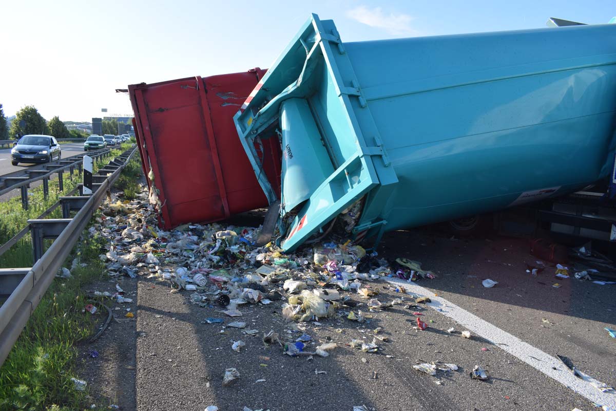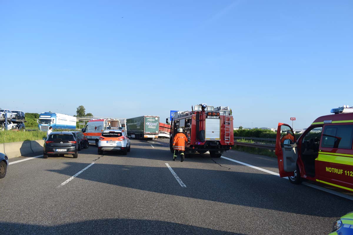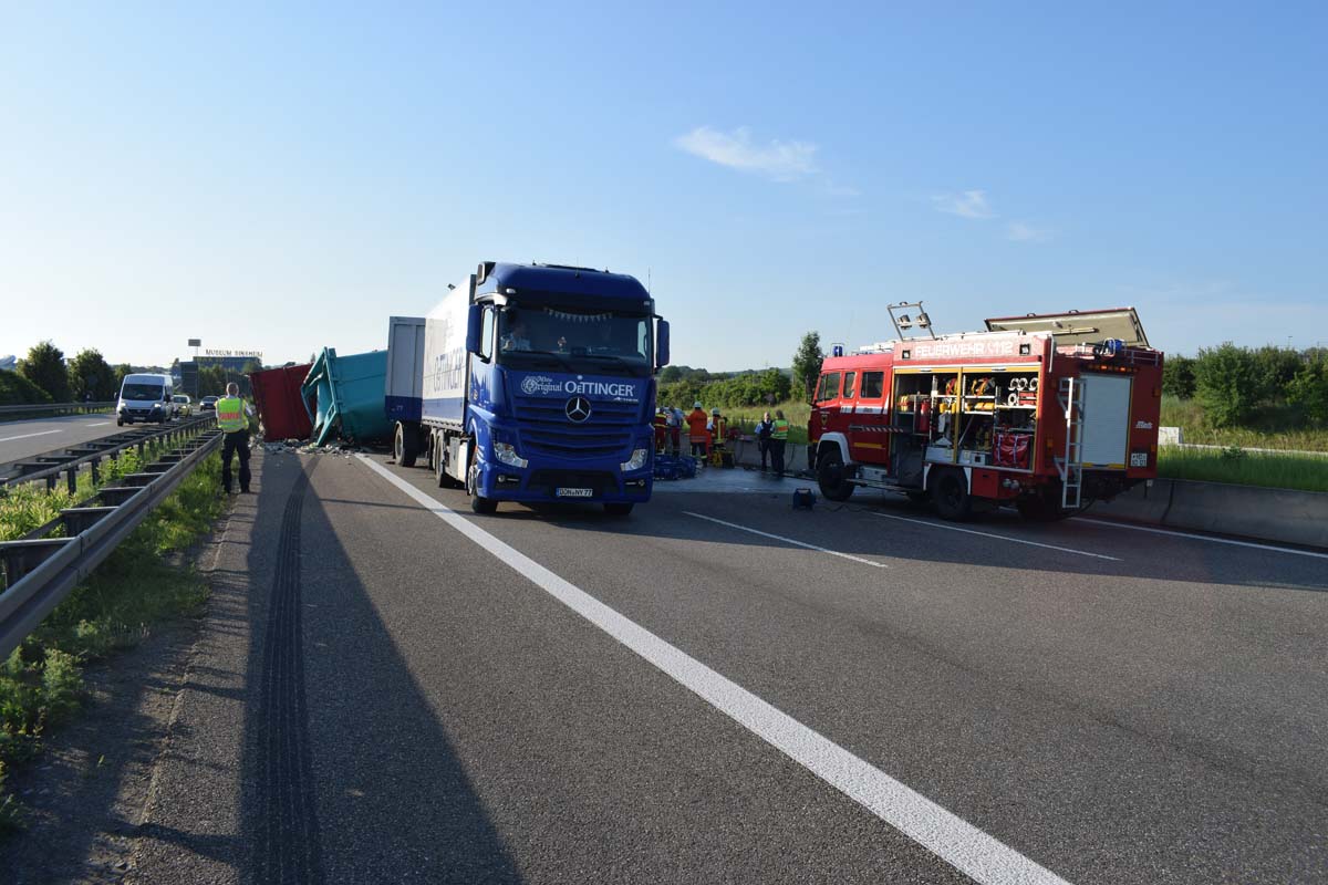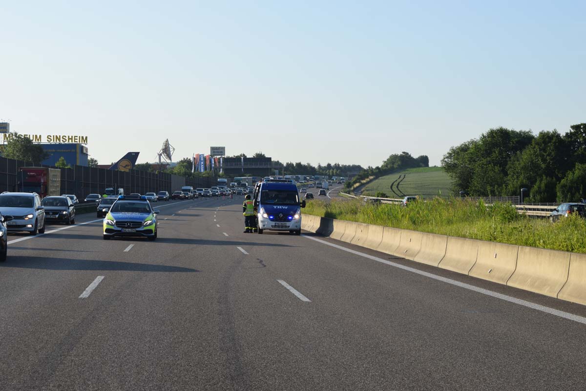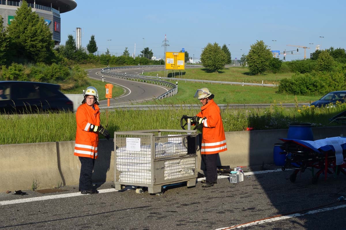 (zg) Ein schwerer LKW-Unfall ereignete sich am frühen Montagmorgen gegen 06.30 Uhr auf der A6 zwischen den Anschlussstellen Sinsheim-Steinsfurt und Sinsheim-Süd in Höhe des Stadions. Nach derzeitigem Stand musste der Fahrer eines Getränkelasters wegen einer Verkehrsstockung anhalten. Ein mit Müll beladener Hängerzug erkannte den Rückstau und bremste ebenfalls ab. Ein mit Farbe beladener LKW übersah jedoch, aus bislang ungeklärter Ursache den Rückstau und schob den Hängerzug auf den Getränkelaster. Bei dem Zusammenprall brach bei dem Hängerzug die Achse und die beiden mit Müll beladenen Container verkeilten sich auf der Fahrbahn. Das Führerhaus des Unfallverursachers wurde bei dem Aufprall bis auf wenige Zentimeter zusammengeschoben. Er musste von der Feuerwehr Sinsheim mit hydraulischem Rettungsgerät aus seinem bis auf ca. 40cm zusammengeschobenen Führerhaus gerettet werden. Nach einer notärztlichen Stabilisierung musste er mittels Rettungshubschrauber in eine Spezialklinik geflogen werden. Die verlorene Ladung und die ausgelaufenen Stoffen müssen nun vom THW umgeladen werden. Die Bergungsarbeiten werden bis in den Nachmittag andauern.